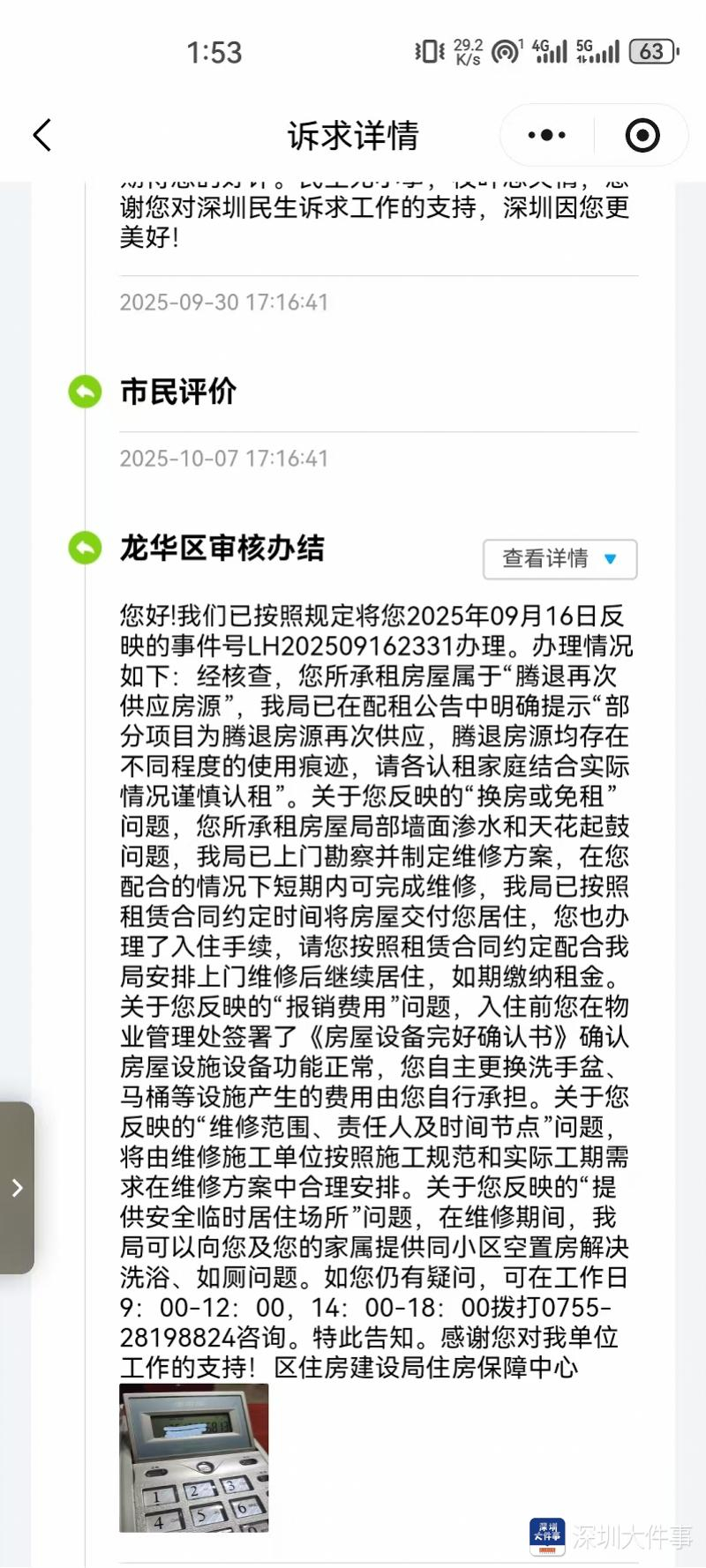 #龙华住建回应公租房墙体发霉开裂#【深圳一公租房墙体发霉、开裂、异味致住户患鼻炎,住建回应】#深圳一公租房异味致母子确诊鼻炎#排队近十年,终于如愿认租深圳龙华壹成中心公租房,本是安居圆梦时刻,一家却陷入糟心困境。新房入住即现墙体渗水发霉、天花开裂鼓包,屋内常年萦绕刺鼻异味;入住半年,母子二人接连确诊鼻炎。住建部门上门维修后问题仍未彻底解决,近日,市民吴女士向南都反映了这一问题。深圳市龙华区住房建设局回应称,腾退房源存在正常使用痕迹,市民反映相关问题已进行维修,后续将持续进行沟通。南都N视频记者 吴灵珊