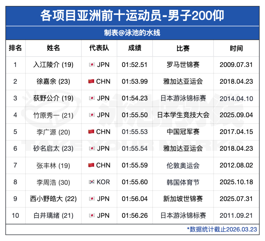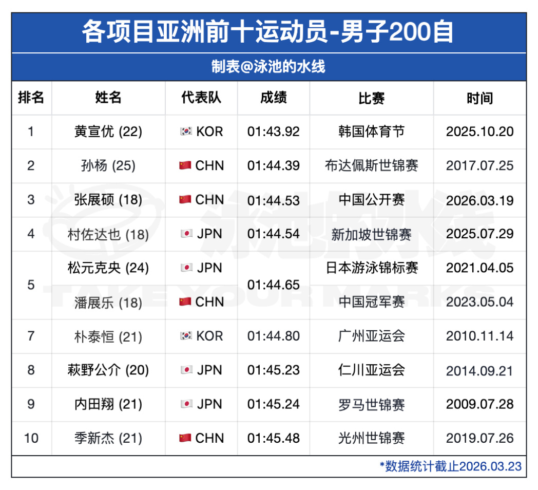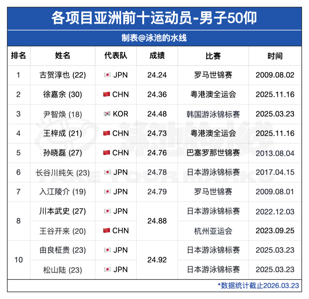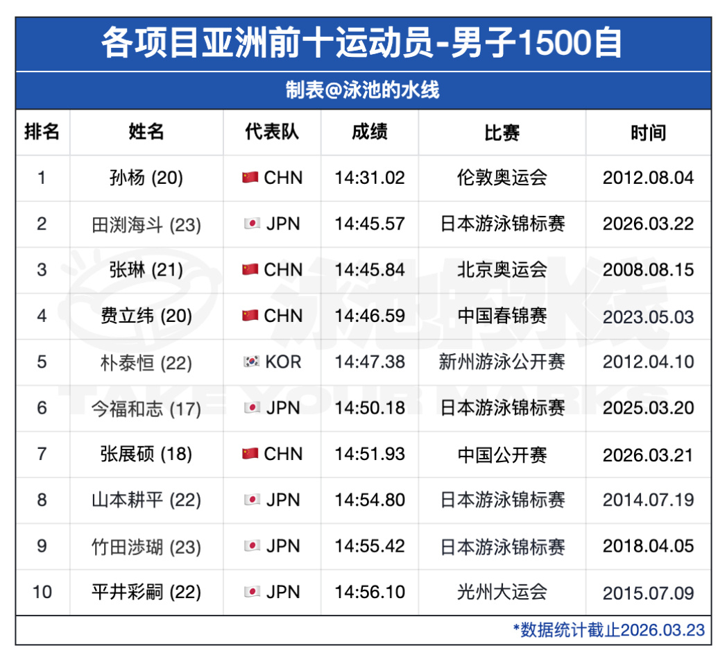 *部分成绩暂未获得世界泳联认证,成绩以及排名仅供参考📊数据统计截止2026.03.30