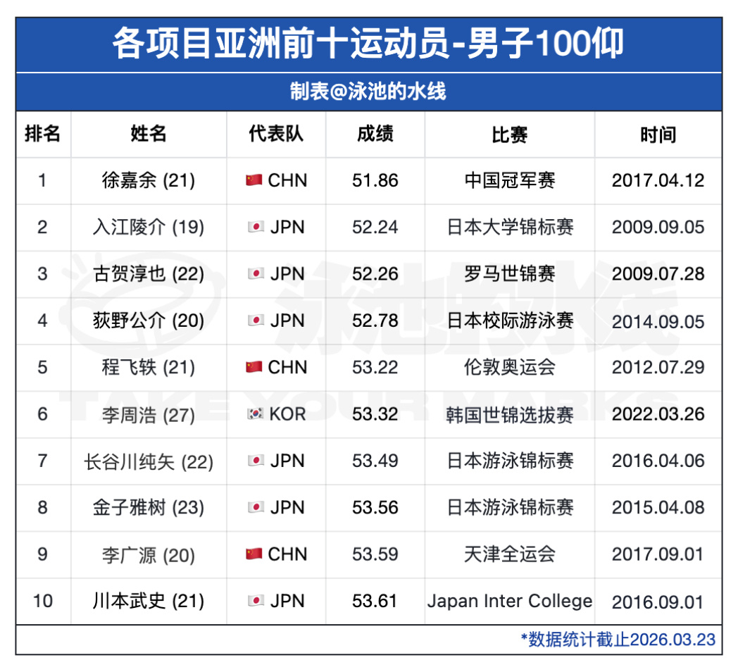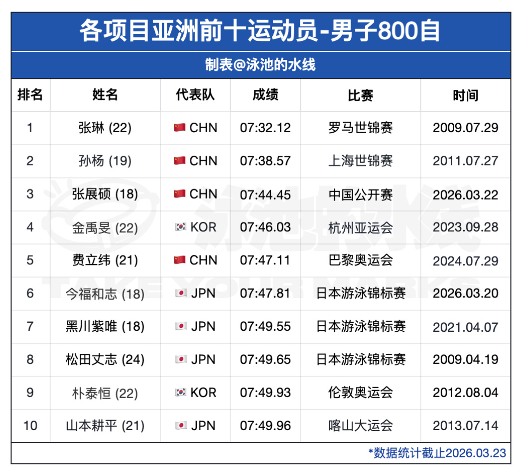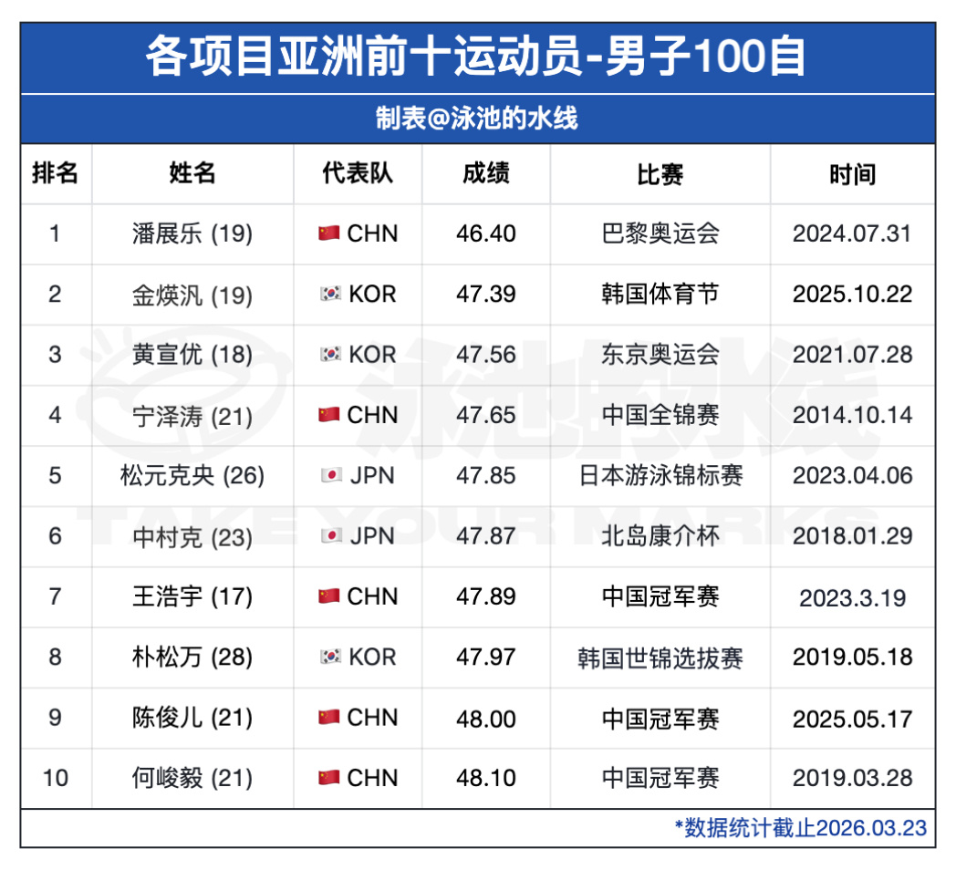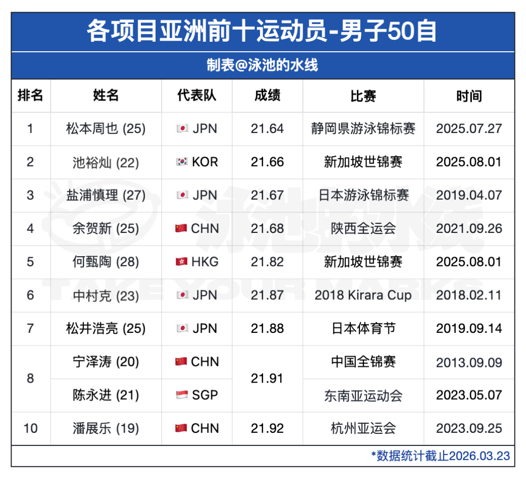 *部分成绩暂未获得世界泳联认证,成绩以及排名仅供参考📊数据统计截止2026.03.30