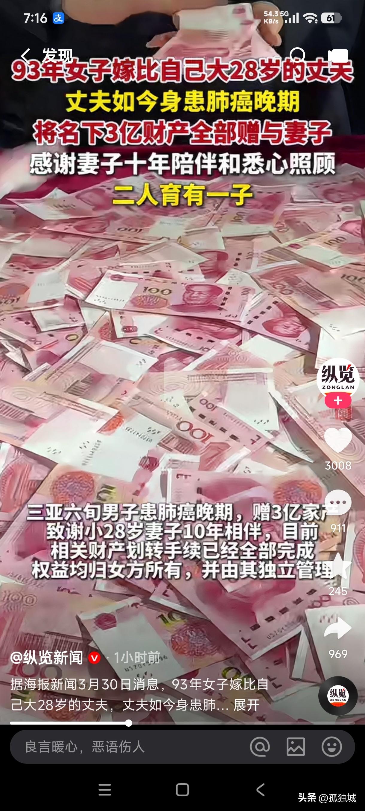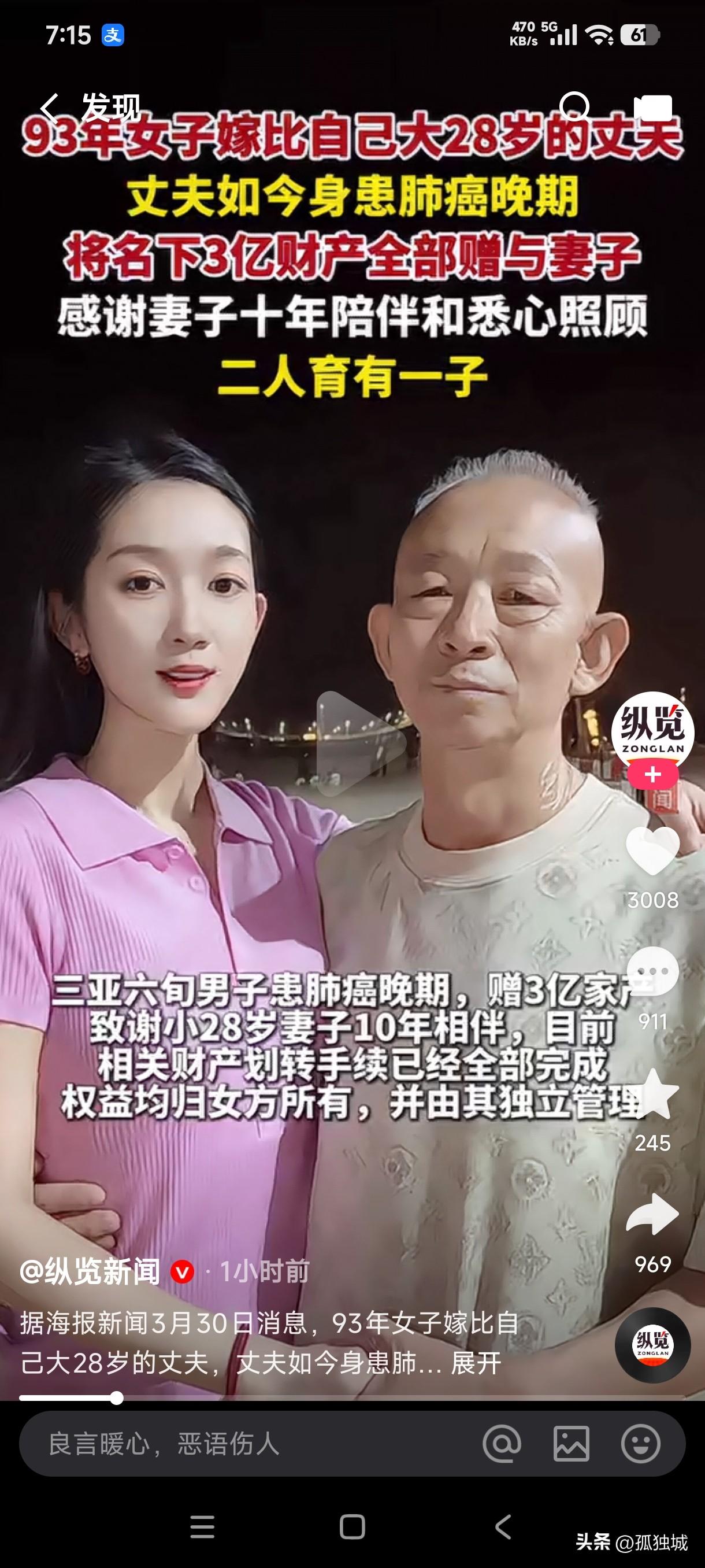 93年出生女子嫁比自己大28岁丈夫,二人携手走过10年婚姻,并且育有一子,如今丈夫身患肺癌晚期,他将名下3亿财产全部赠与妻子,相关财产划转手续已经全部完成,权益均归女方所有,并且由其独立管理! 问世间情为何物,直教人生死相许,这年龄相差如此之大的爱情是不是让人既羡慕又嫉妒,对于老头而言,找个比自己小很多的小娇妻是不是也很幸福,既能为自己生儿育女,又能贴身照料陪伴左右,这不就是别人口中所说的真爱吗?如今老头即将撒手人寰,他把名下所有的财产都给了小娇妻,既然老头不能陪伴她后半生,就让金钱陪伴她后半生也足矣是不是?