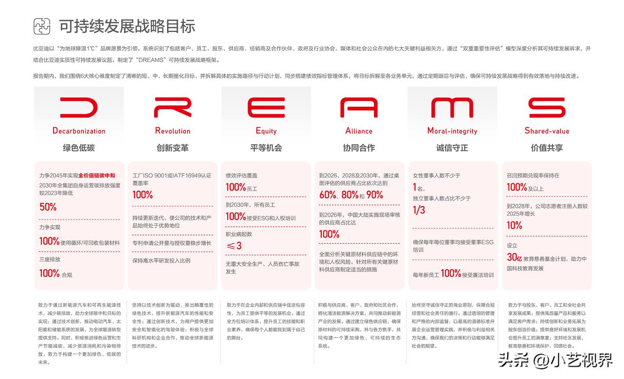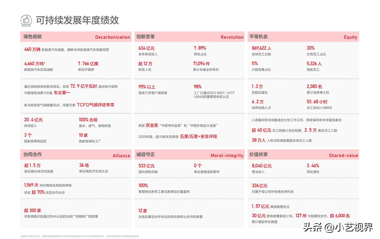 比亚迪发布2025年ESG报告,三大绿色梦想,正一一实现 看完比亚迪最新发布的2025年ESG报告,更加坚定了比亚迪是一家伟大公司的判断,他用实际行动践行绿色低碳,坚定实现绿色梦想。 ESG是由环境、社会和治理三个维度构成的可持续发展评估体系,用于衡量企业在非财务领域的表现。从企业的营收只能看到短期经营状况,从ESG报告却可以看到企业的未来。比亚迪标普评分跃升至60分,明晟MSCI 提升至AA,位列中国企业第一梯队,并获得福布斯中国50榜单、上市公司可持续发展最佳实践案例等国内外ESG奖项。 通过比亚迪公布的ESG报告可知,2025年比亚迪研发投入634亿,占营收比例7.89%,研发人员超12万名,全球累计申请专利71094件,最新发布的第二代刀片电池及闪充技术,创造了全球量产最快充电记录,做到了“5分好、9分饱、3分寒”,实现了油电同速,闪充中国战略扩展至海外,推动全球能源的绿色转变。 同时,2025年比亚迪新能源汽车销量超460万辆,相比传统燃油车,减少了4660万吨碳排放,相当于植树7.766亿棵。经过十多年的坚持,王传福在2006年提出的“三大绿色梦想”:电动车、储能、太阳能领域,正在一步步走向现实,新能源汽车销量全球第一;储能出货量突破135GWh,全球第一;太阳能入选全球一级光伏组件制造商榜单。 产品上,比亚迪在2023-2025年期间,共有19款车型获得C-NCAP五星评级;深度参与了18余项国家及行业标准研制;加入IAFF成为核心成员,能够参与全球汽车标准的制定;2026年中国大陆实施现场审核供应商占比100%。 除此之外,比亚迪员工的保险覆盖率高达100%;设立的30亿教育慈善基金,2025年捐赠支出1.57亿;国内纳税总额533亿元。 通过比亚迪2025年ESG报告可以清晰的了解企业未来发展前景,了解公司的研发投入、社会责任、发展战略等,比亚迪目标不只是新能源汽车,而是广阔的星辰大海。