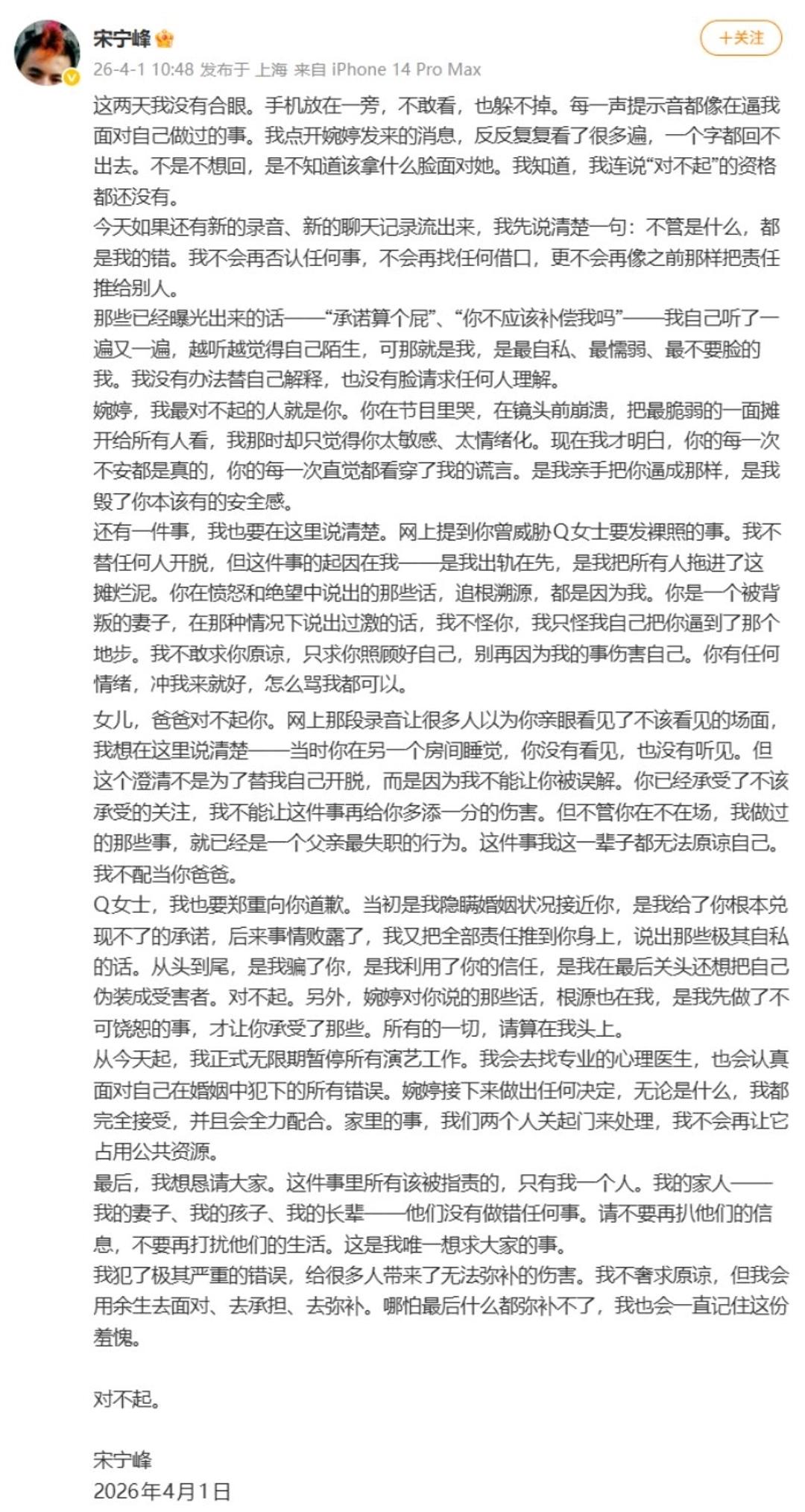 4月1日,演员宋宁峰发布长文。 他全盘承认婚内出轨,同时宣布无限期暂停演艺工作。 整件事的导火索,来得格外直接。 3月31日,他与出轨对象的对话录音曝光,所有隐瞒彻底藏不住。 他不仅违背婚姻忠诚,还曾带着女儿和对方见面。 事后反倒想推卸责任,试图用谎言掩盖一切。 在道歉长文里,他没找任何借口。 他直言最愧对妻子张婉婷,承认自己亲手将对方逼入崩溃境地。 也向女儿致歉,坦言自己没能尽到为人父的责任。 更对被蒙骗的对方,承认了自己的欺骗与过错。 他主动选择无限期停工,也表示会接受心理疏导。 同时坦然面对妻子的任何决定,没有半点推诿。 这事发酵后,网友的看法吵得不可开交。 有人觉得他敢作敢当,总算有认错的态度。 也有人直言,再诚恳的道歉,也补不好破碎的信任。 其实娱乐圈里,艺人失德塌房早已不是新鲜事。 但比起诸多甩锅、卖惨的公关套路,他这次主动担责,确实多了几分真心。 可话说回来,道歉从不是免责牌。 暂停工作也只是自我反思的开始,并非弥补伤害的终点。 婚姻的底线本就是忠诚,一旦触碰,便是对家人最狠的伤害。 一句对不起,换不回被消耗的感情,也抹不掉留下的伤痕。 真心认错,从来不是靠一篇文案、一个决定。 而是往后长久的自省与改正,用实际行动去弥补过错。 也希望这件事,能给所有人提个醒: 无论身处何种身份,守住底线、扛起责任,才是做人的根本。