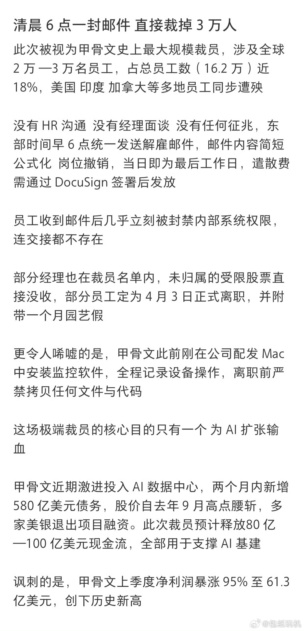 甲骨文凌晨6点突发裁员3万人甲骨文在营收创新高的情况下,一口气裁掉3万员工,一边砍传统业务的人力,一边把资源all in云服务和AI赛道。现在很明显的风向是,传统IT岗位的护城河正在变浅,不跟上AI技术迭代的话,就要被淘汰了。