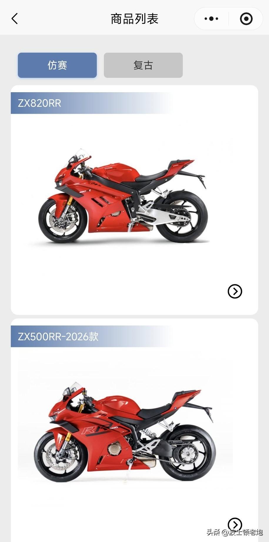 张雪机车小程序做的简洁明了,没有那么多花里胡哨,一共三款车,每款车三个颜色: ZX820,RR版 43800元、RR-R版61980元 ZX500,双摇臂29800元、单摇臂33680元 500F,29980元