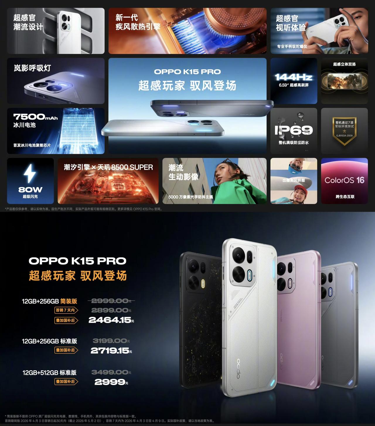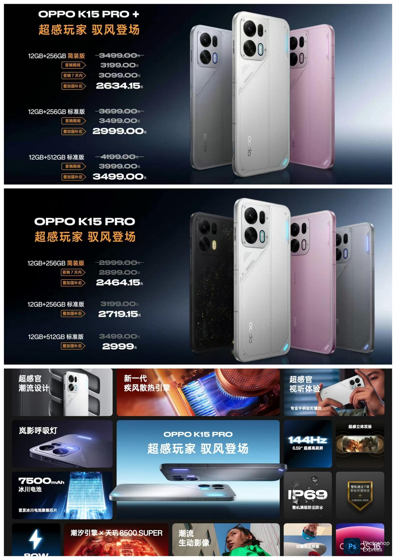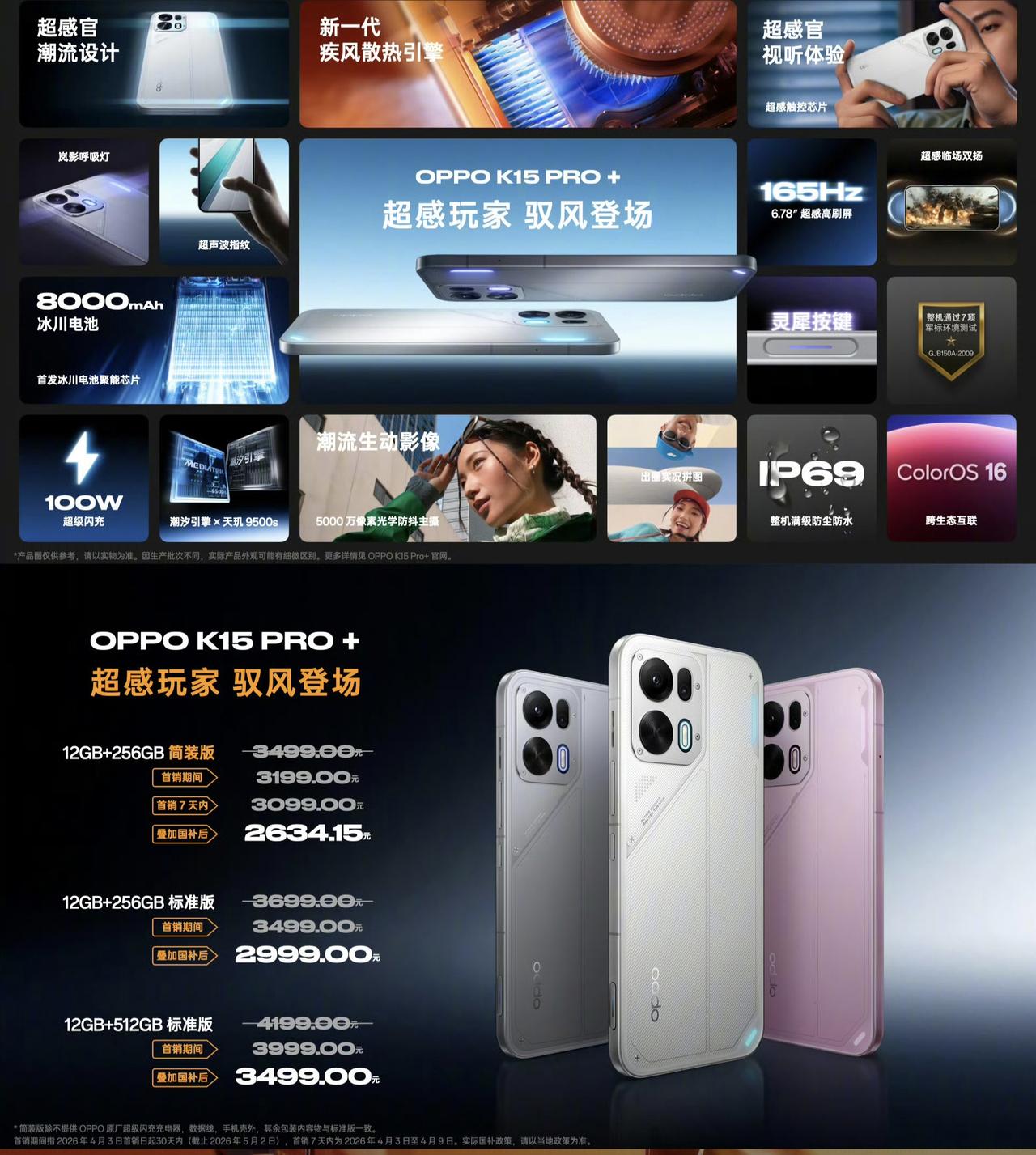OPPO K15 Pro系列发布,2999元起。 内存涨价带来的影响是真恐怖,OPPO K15 Pro定价2999元至3499元,首销期2899元起,叠加国补后2464.15元起。其中,入门款是没有充电器的简装版,价格便宜一些。 OPPO K15 Pro+定价3499元至4199元,首销期3199元至3999元。这个价格是以前性价比品牌旗舰机的定位,还是内存涨价不得不上调售价。 外围配置还行,Pro是联发科天玑8500芯片,Pro+是联发科天玑9500s芯片,金属中框,IP69防水,大电池也都有。