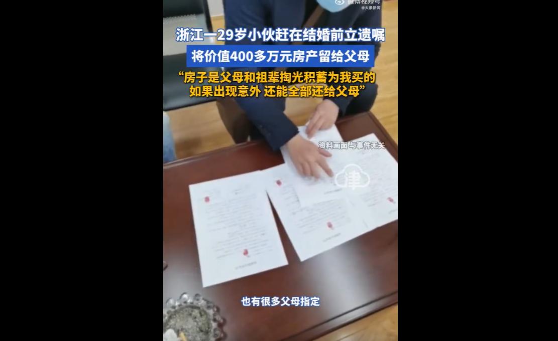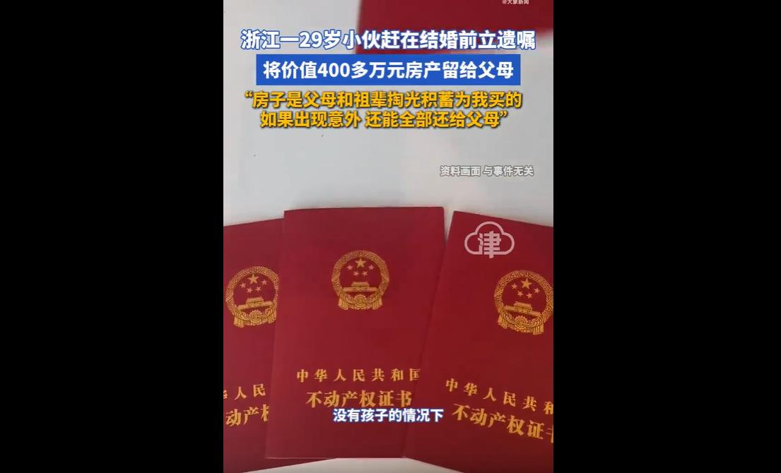 浙江宁波29岁小伙婚期定在今年5月,婚前立遗嘱将价值400多万元的房产留给父母,称房子是父母和祖辈掏光积蓄所买,若自己出现意外且无孩子,房产需归还父母。 此事引发热议,也折射出年轻人婚恋中财产与情感的两难。 理解小伙的初衷,也共情他的考量。、 29岁的年纪,即将步入婚姻殿堂,本是奔赴幸福的时刻,他却提前立下遗嘱,并非对婚姻缺乏信心,更不是对未来配偶心存恶意,核心只是想守护父母和祖辈的心血。 这套价值400多万的房产,是家人掏光积蓄换来的,承载着原生家庭的托举与期盼,小伙担心自己若遭遇意外,这份辛苦积累的资产无法回归家人,于是用立遗嘱的方式守住这份底线,这份孝心与担当,值得被理解。 网友的热议,本质上是对婚姻本质的不同解读。 有人感慨“奔着幸福去,却先铺好了退路”,道出了当代年轻人对“意外与明天不知哪个先来”的焦虑,这份焦虑,源于生活的不确定性,也源于对原生家庭责任的敬畏。 也有网友认为,此举隐含对配偶的防备,若未提前沟通,容易埋下婚姻信任的隐患,这种担忧也并非多余——婚姻本应是彼此信任、相互托付的情感共同体,若一方擅自做出涉及财产的重大决定,确实可能让另一方感受到疏离与不信任。 这场争议的核心,终究绕不开一个问题:婚姻到底是情感共同体,还是财产联盟? 其实,二者并非对立,好的婚姻,既有情感的共鸣,也有理性的规划。 小伙的行为,看似是“算清身后事”,实则是对婚姻风险的理性规避,并非否定情感的纯粹性。 在现实生活中,因婚姻破裂、意外离世引发的财产纠纷不在少数,很多原生家庭的心血付诸东流,小伙提前立遗嘱,只是用法律手段,为原生家庭的资产加上一层保障,这份理性,不该被简单解读为“情感疏离”。 不可否认,若小伙未与未婚妻提前坦诚沟通,确实可能引发误会。 婚姻中的信任,源于坦诚与透明,涉及房产、存款等重大财产的规划,理应双方共同商议、彼此理解。 毕竟,婚姻是两个人的事,既要考虑原生家庭的付出,也要兼顾配偶的感受,唯有提前沟通,说明自己的初衷与考量,才能避免不必要的猜忌,让法律层面的规划,不伤害情感层面的信任。 我们不必苛责小伙的“未雨绸缪”,也不必过度解读这份遗嘱背后的“防备”。 每个人都有守护自己和家人权益的权利,而婚姻的真谛,也从来不是“毫无保留的付出”,而是“彼此理解、相互包容”。 小伙守护原生家庭的心血,无可厚非;而网友担忧的信任隐患,也提醒着每一位即将步入婚姻的人:坦诚沟通,才是化解财产与情感矛盾的关键。