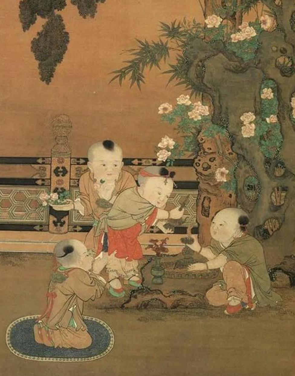 宋朝孩子童年都玩什么游戏?其实欢乐很多,不输现代。北宋画家苏汉臣早年在汴梁做过民间画工,后来进了宣和画院,专门画人物,尤其喜欢捕捉小孩玩耍的样子。他的画作里记录了不少庭院里的场景,让人看到那时候的孩子怎么在日常里找乐子。 在农历四月初八这天,宋朝许多家庭的小孩会跟着大人去寺院。孟元老在《东京梦华录》里记过,汴京的十大禅院办浴佛斋会,寺里煮香药糖水分给信众。 孩子们看见铜佛像摆在盆里,就学着大人用勺子舀水浇上去。有的小孩跪在地上学礼拜,有的抬着小佛像,有的拿着水瓶,还有的捧花篮装成僧人模样。他们把庄严的仪式变成自家院子里的模仿游戏,边玩边笑,家里大人也不拦着。 这种模仿从南北朝时梁武帝崇佛开始,慢慢传到宋代,成了小孩接触佛教习俗的自然方式。苏汉臣画的《灌佛戏婴图》就留下了这个瞬间,四个孩子围在一起,动作认真又带点稚气。 玩完之后,他们可能还分到一点浴佛水喝,觉得这样能沾点福气。整个过程让小孩在欢乐中记住节日的规矩,也让佛教在街巷庭院里传得更广。 换到秋天,庭院里枣子熟了,孩子们就开始动手做玩具。苏汉臣的《秋庭婴戏图》里,一对姐弟头挨着头,坐在圆凳边全神贯注。 姐姐穿红衣,弟弟穿白衣,他们先挑大枣削掉半边露出枣核,再插三根短棍做成三角小台子,然后取细竹篾两头各插小红枣,把竹篾中点挂在枣核上,轻推一下,三角台就转起来。 谁推的时候竹篾上的枣掉下来,谁就输,输家要给对方枣子。姐弟俩你推我接,眼睛盯得紧紧的,生怕力气用不对。苏汉臣画这幅时大概在北宋徽宗宣和年间,画中背景还有转盘和小佛塔,说明当时玩具在汴京潘楼街一带的市场上已经不少见。 周密后来在南宋临安写的《武林旧事》也提到儿戏物品名目繁多,这些旋转的玩意儿在南方继续流行。姐弟玩着玩着,时间不知不觉过去,秋风吹过芙蓉花,他们脸上满是专注的劲头,却又藏着小竞争的心思。 输赢之间,小孩学会了耐心和控制力,这种游戏用的是自家树上的枣和随手找的竹子,成本低却有趣味,从秋季采枣一直连到庭院对玩,串起了季节变化和家庭里的小教育。 到了冬日,庭院里梅花山茶开着,孩子们又把注意力转向家里的小猫。苏汉臣传的《冬日婴戏图》画了两个小孩,一个胆子大站在前面,另一个矮个子躲在后面。 姐姐右手摇着锦旗,弟弟用细红线牵一根孔雀羽毛,在猫跟前晃来晃去。 小猫炸着毛,伸爪子想扑,却又停住,眼睛亮亮的。孩子们一边试探一边后退,笑声混着猫的叫声。宋代城市生活富足,家里养猫常见,猫帮着抓老鼠护粮食,也成了小孩的玩伴。 孟元老记汴京市民生活丰富,庭院就是天然游乐场,逗猫和捉蝶观鱼排在一起。 李嵩等画家也画过货郎担卖鸟笼拨浪鼓的场景,间接支持这种互动。苏汉臣自己从民间画工做到南宋隆兴初任承信郎,画佛像还得到称赞,他的婴戏图因此既贴近市井又细腻。 逗猫时,小孩学着不伤到动物,轻轻试探界限,猫被看作聘来的家庭成员,养的时候讲究规矩。这种游戏让孩子在冬日冷空气里动起来,观察动物的反应,慢慢懂得温柔和耐心。 这些玩法前后连着,从四月浴佛的宗教模仿,到秋天枣子的自制玩具,再到冬日与猫的互动,反映出宋代经济繁荣下小孩的日常。 苏汉臣生于1094年左右,活动在12世纪,他的画成为视觉记录,补足了文字笔记里的描述。 孩子们在庭院里玩,家长在旁看着,社会稳定让这种乐趣得以延续。明清时候类似场景还有记载,说明影响一直往下传。