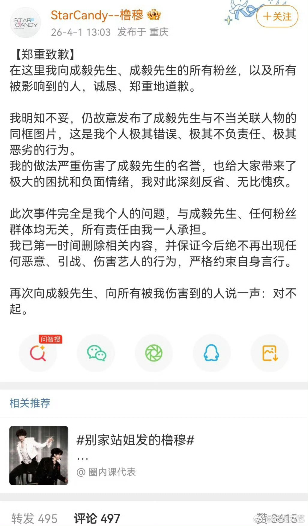 橹穆站姐道歉橹穆站姐向成毅道歉