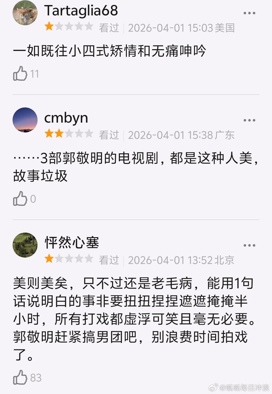 郭敬明《月鳞绮纪》今天首播,这热度也太低了吧,到现在豆瓣短评也就781条,而且好多差评。鞠婧祎、曾舜晞、陈都灵、田嘉瑞全明星阵容,却被说剧情慢、没有看下去的欲望,尤其滤镜磨皮可怕!3部郭敬明的作品,都是这种人美故事不行。看过的来说说,真是这样吗?