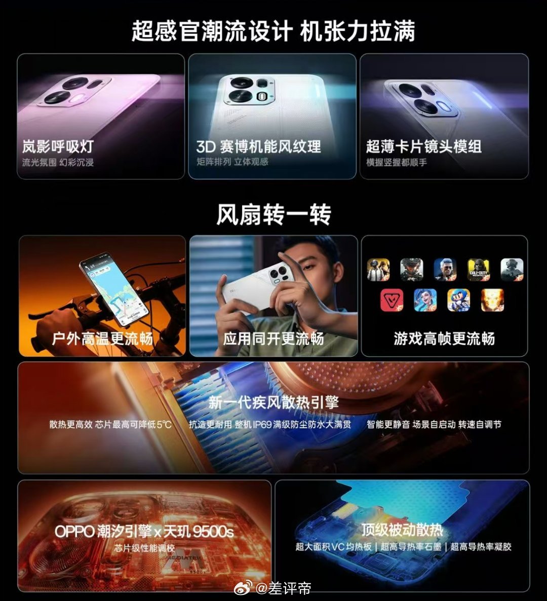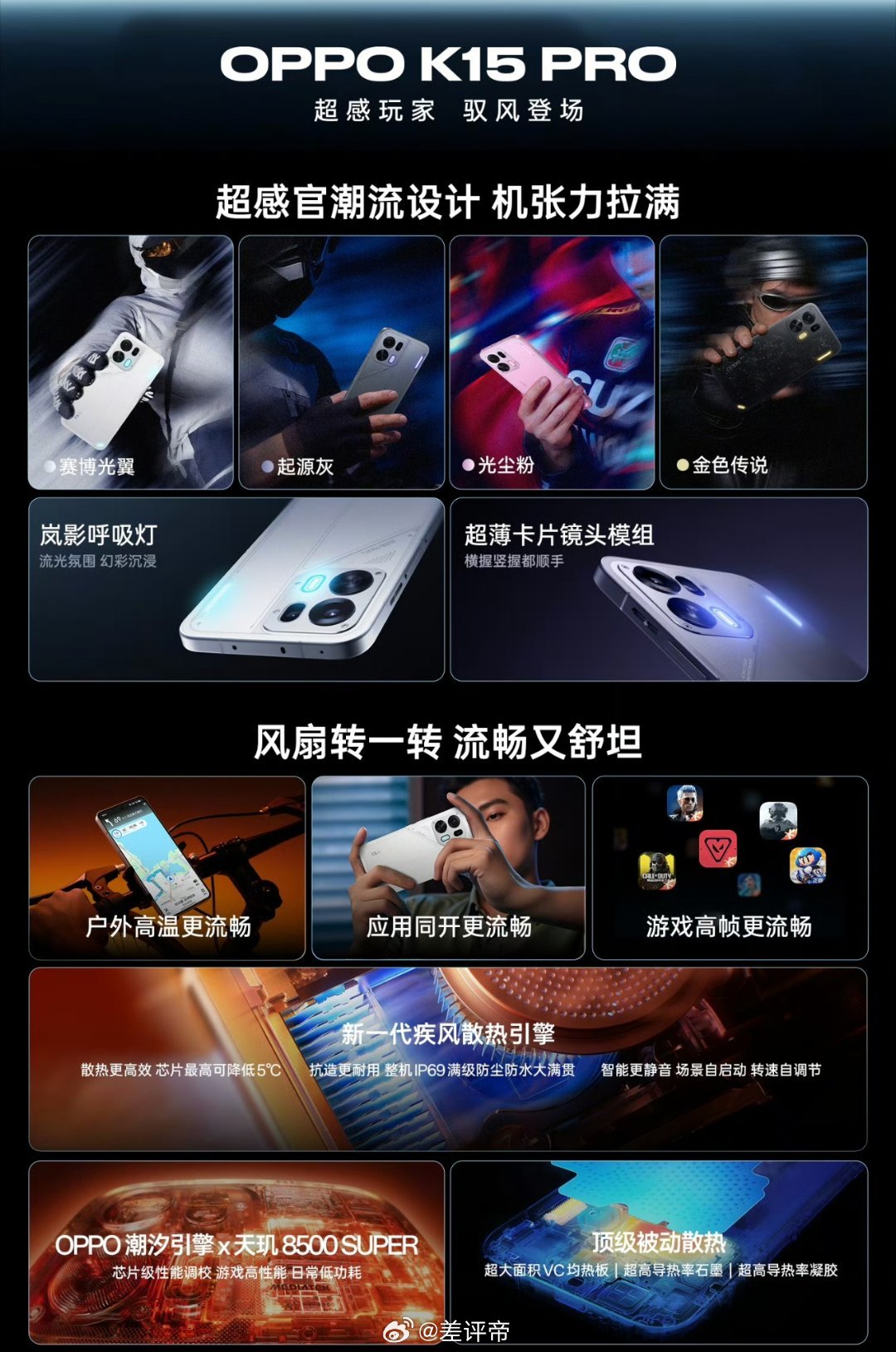 性能与散热OPPO K15 Pro:搭载天玑8500 SUPER芯片,配合OPPO潮汐引擎进行芯片级性能调校。内置新一代疾风散热引擎(含主动散热风扇),宣称可使芯片最高降温5℃,并支持IP69级防尘防水。 OPPO K15 Pro+:升级为更强的天玑9500s芯片,同样配备新一代疾风散热引擎和顶级被动散热材料(超大面积VC均热板等)。
