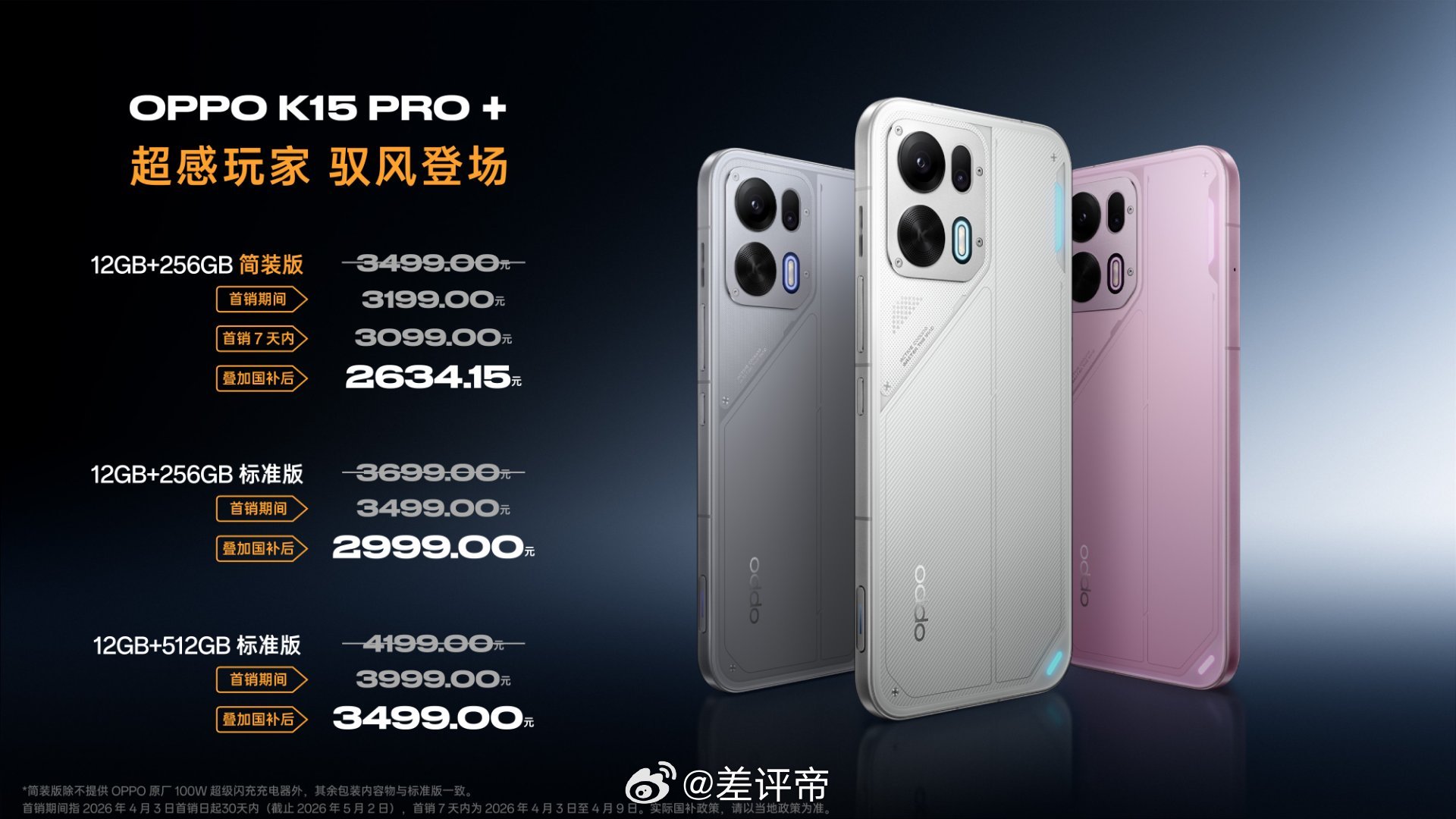 OPPO K15 Pro+12GB+256GB 简装版:零售价3499元,首销期间3199元,首销7天内3099元,叠加国补后2634.15元。12GB+256GB 标准版:零售价3699元,首销期间3499元,叠加国补后2999元。12GB+512GB 标准版:零售价4199元,首销期间3999元,叠加国补后3499元。
