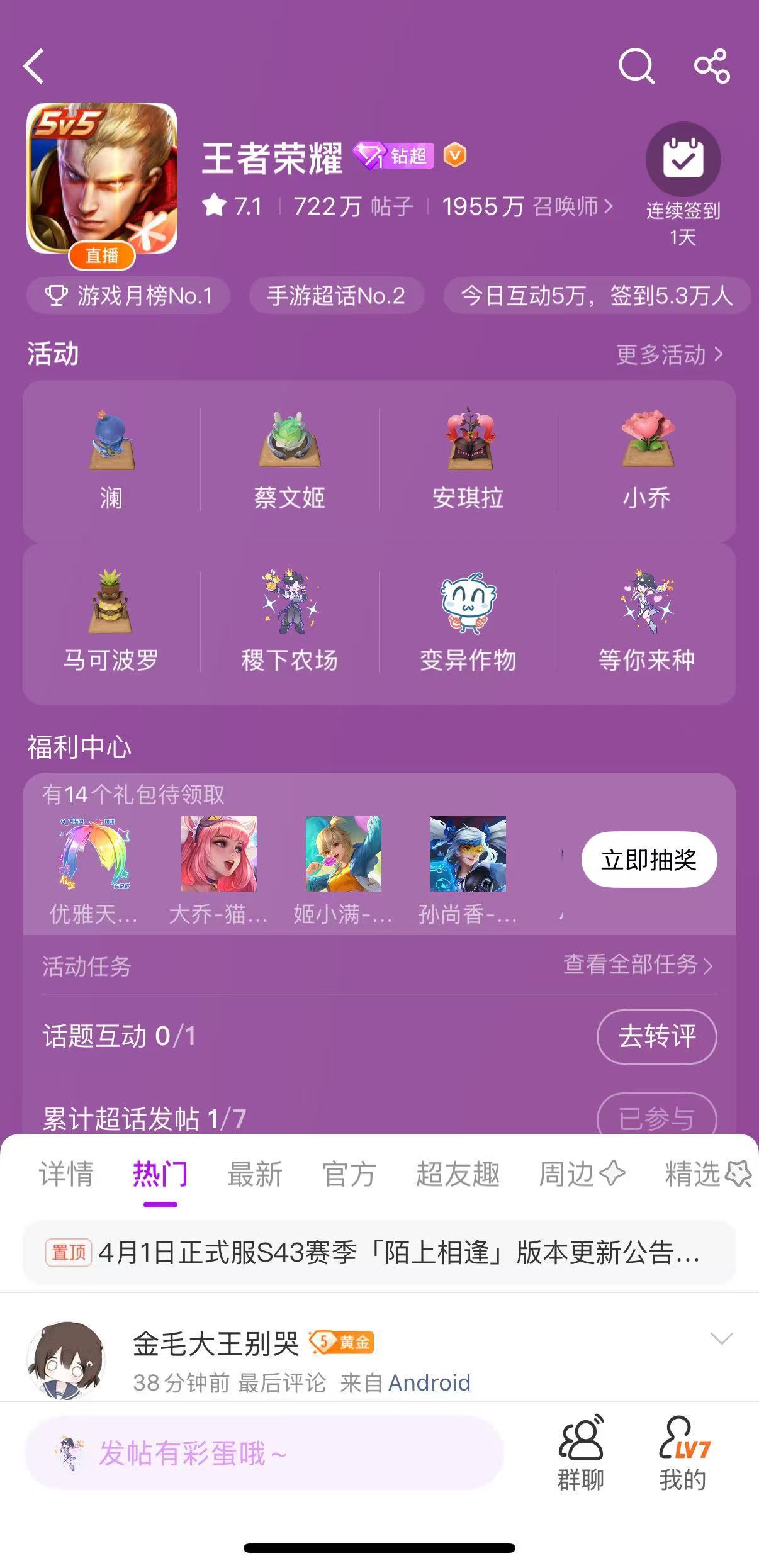 王者超话变异了王者荣耀S43赛季稷下农场上线后,超话直接换了一整套农场主题UI
