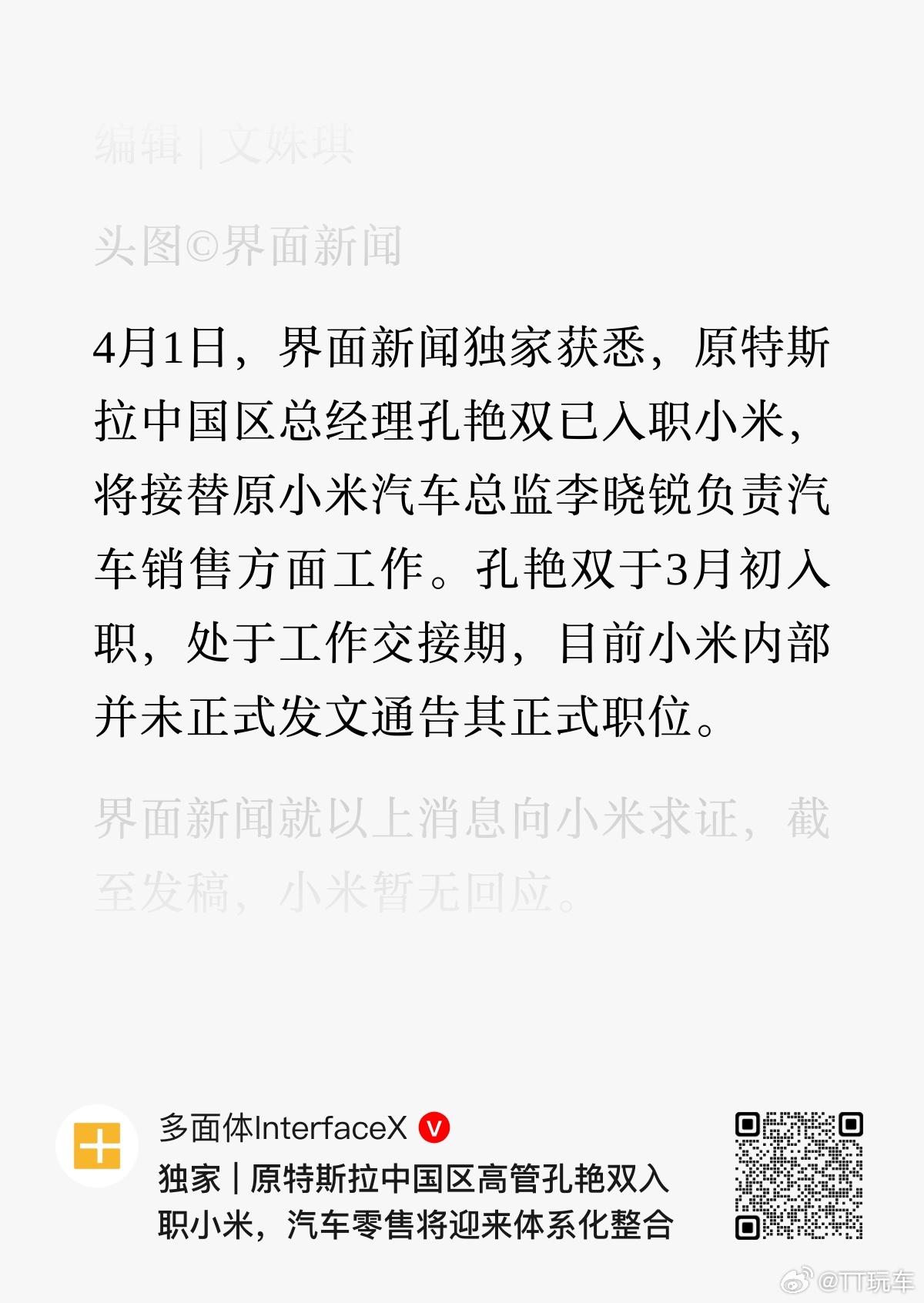 小米汽车 4月1日,界面新闻独家获悉,原特斯拉中国区总经理孔艳双已入职小米,将接替原小米汽车总监李晓锐负责汽车销售方面工作。与孔艳双同一时间入职小米还有一位特斯拉背景的员工。该员工名为“Eason”,任小米汽车部“政委”,同属小米参谋部成员。看来要开始重点培养一线销售的能力了。
