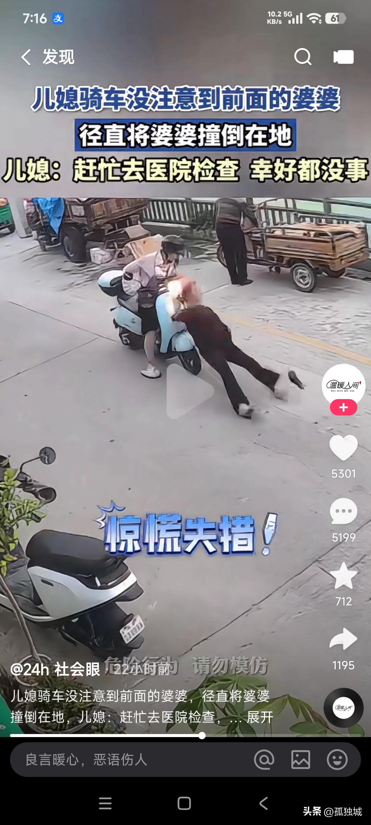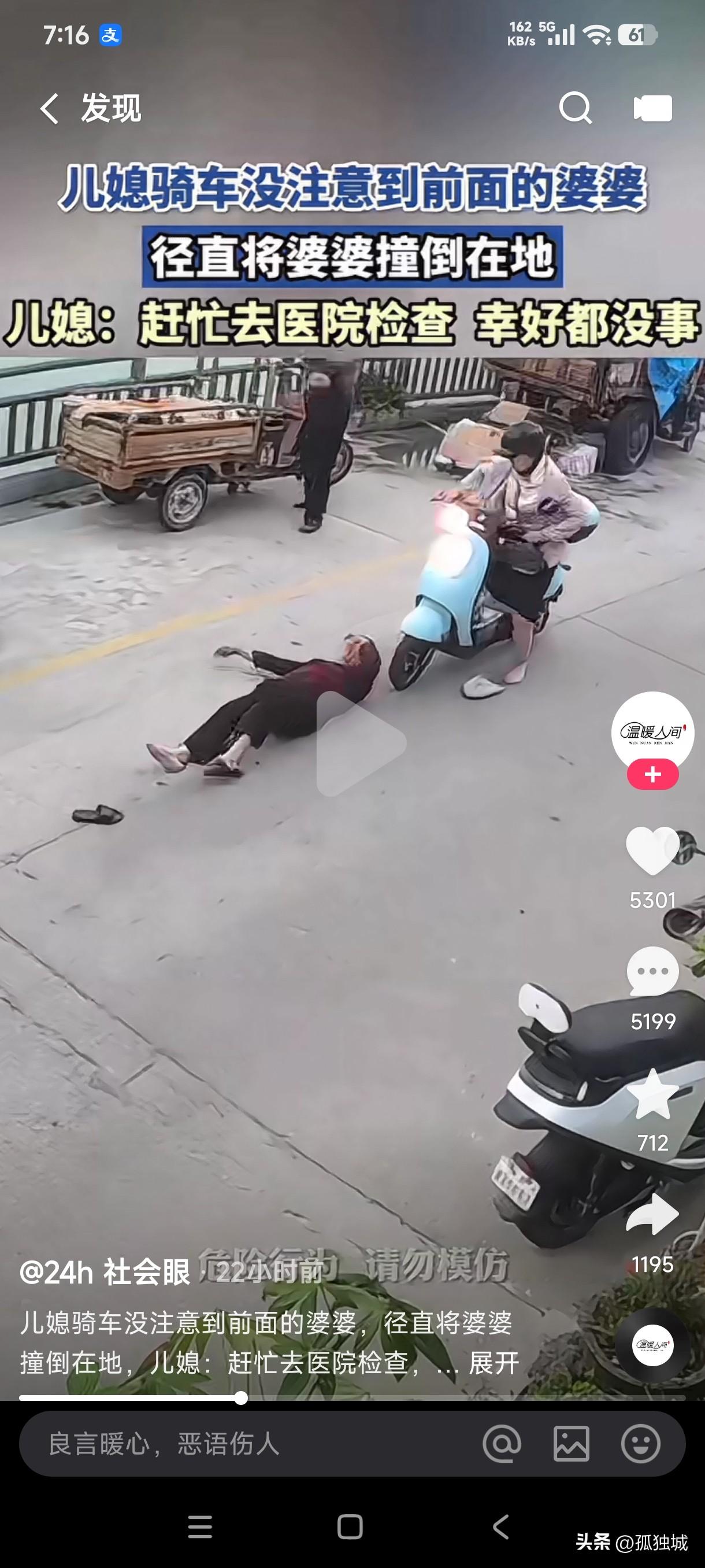 儿媳妇骑车径直向前忽视了站在前方的婆婆,随即把婆婆撞倒在地,儿媳立即送婆婆去医院检查,索性一切安好…… 这一幕真是让人哭笑不得,一个大活人站在路上骑车的人居然没看见,这要是别人撞了不管是什么理由还能说的过去,但这是自己的儿媳妇把婆婆给撞了,这该让人如何理解呢?到底是这儿媳妇真的没有看到婆婆站在路上,还是她故意骑车撞的婆婆?这得亏是平日里相处融洽的婆媳,这要是有深仇大恨的婆媳,这一幕是不是结下了永久的渊源,彼此之间是不是会闹得不可开交?真的不敢相信这儿媳妇没看见婆婆的存在,她是不是故意撞婆婆的?