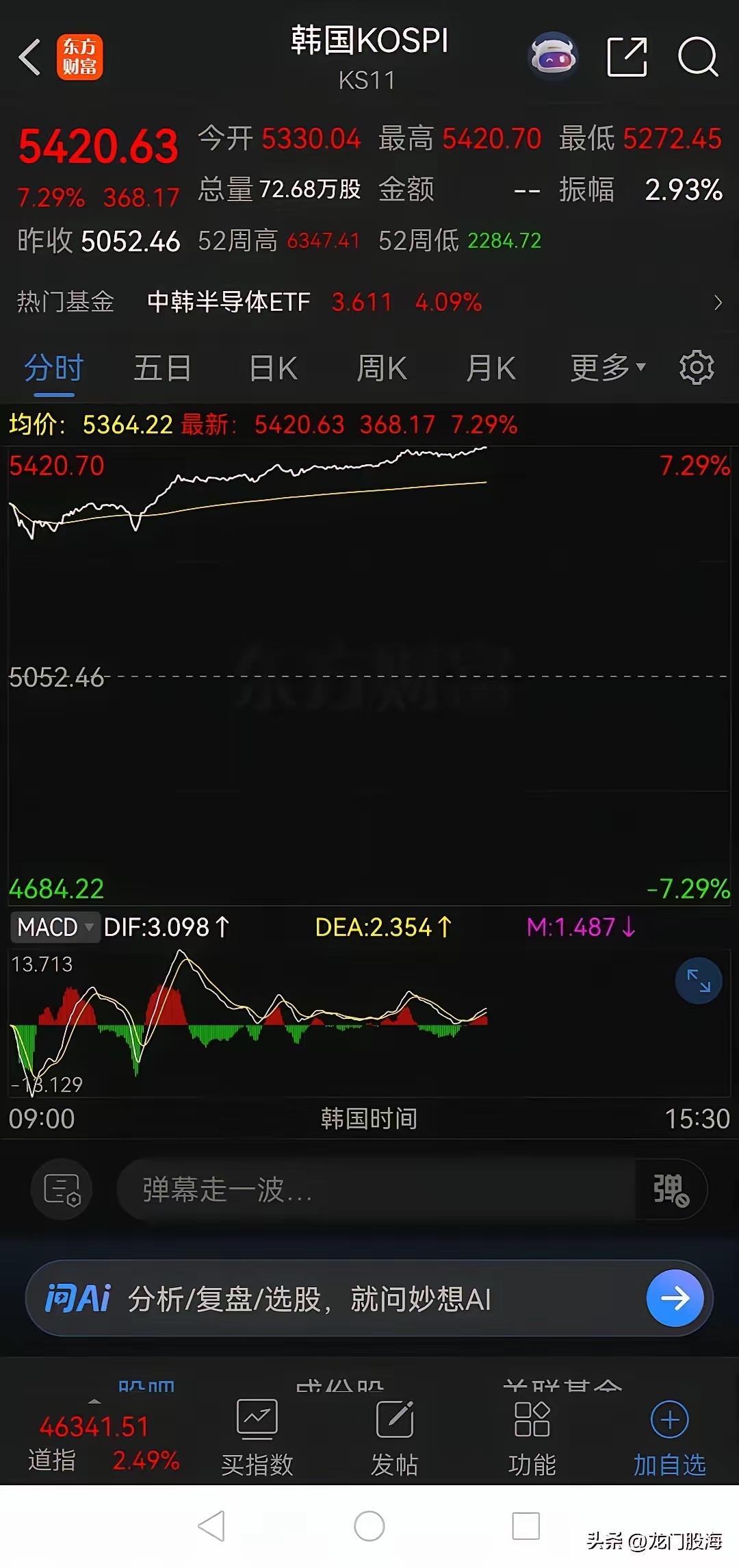 4月1日,亚太股市呈现反弹态势,日韩股市喜迎开门红。韩国综合指数涨幅超8%,报5465.480点;日经225指数涨幅超4%,报53403.670点,且日经225大涨超2600点。韩股中,三星电子涨幅超13%。市场情绪得以改善,让股民们看到了希望