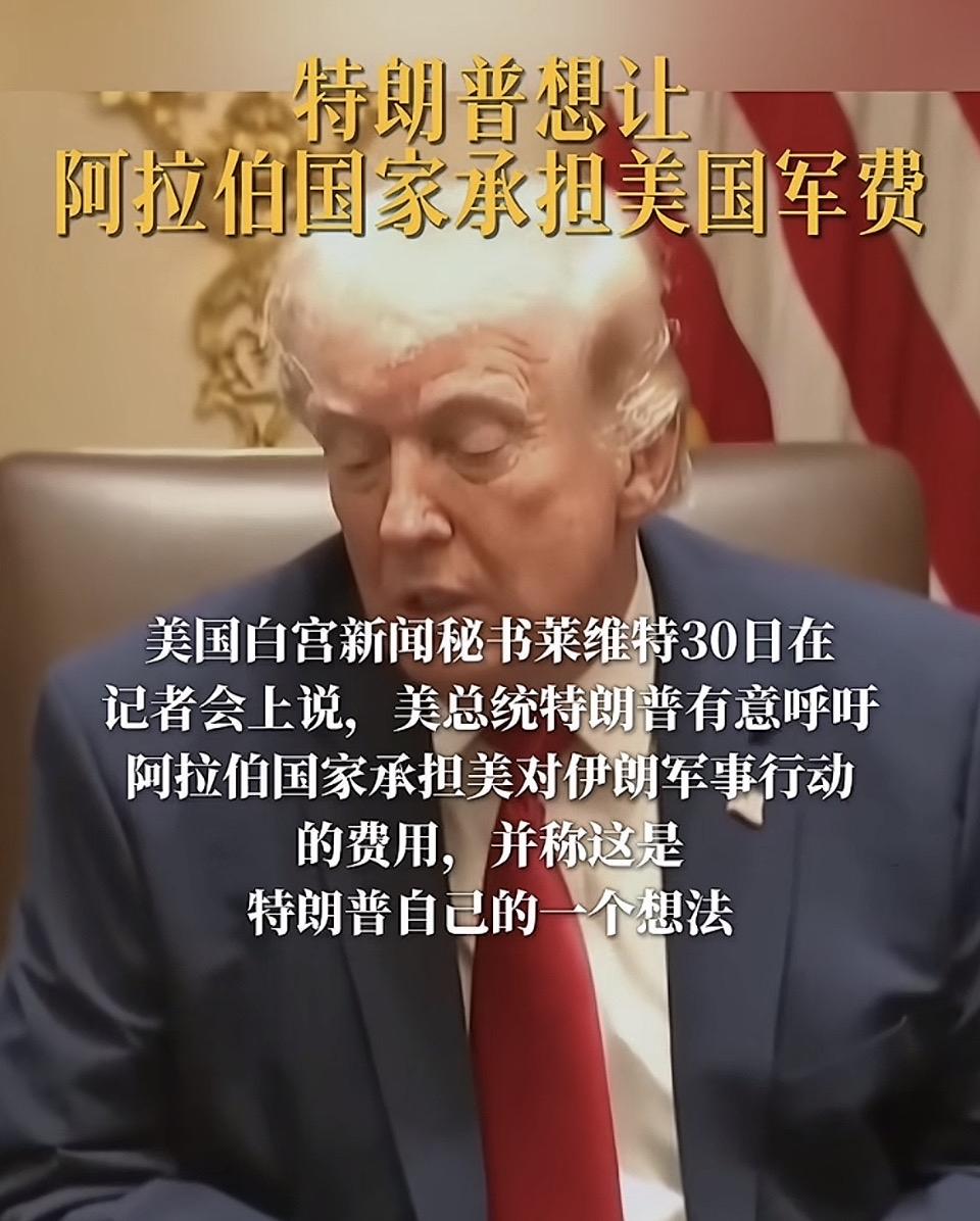 特朗普的“甩锅”算盘?特朗普又打出一张“经济牌”。据白宫新闻秘书莱维特透露,特朗普正打算呼吁阿拉伯国家全额承担美国对伊朗军事行动的费用。 一边是维护中东霸权的“安全成本”,一边却想把账单直接甩给盟友,这种“只出钱不担责”的逻辑,尽显美式霸权的现实与自私。阿拉伯国家是否会买单?这笔账背后,又藏着特朗普怎样的地缘算计? 美式霸权的新账单,特朗普政府再次将“薅盟友羊毛”摆上了台面。最新消息显示,特朗普有意让阿拉伯国家掏钱,买单美国在中东的对伊军事行动。 这一手玩得极其“精明”:既想维持美国在中东的军事存在,又想减轻自家的财政负担。然而,把维护地区安全的成本转嫁至盟友身上,暴露的不过是美国霸权日渐式微下的焦虑。当保护伞变成了“收费单”,盟友的离心力,恐怕才是美国真正的心腹大患。 中东棋局的新变数,特朗普的想法很直接:打伊朗,让阿拉伯人出钱。 这一表态瞬间搅动了中东敏感的神经。一边是美国咄咄逼人的军事施压,一边是要求盟友“平摊账单”,这不仅是赤裸裸的利益索取,更是对地区格局的一次重新洗牌。阿拉伯国家将如何回应这种“霸王条款”?是被迫妥协还是另寻出路,这将深刻影响未来中东的地缘政治走向。