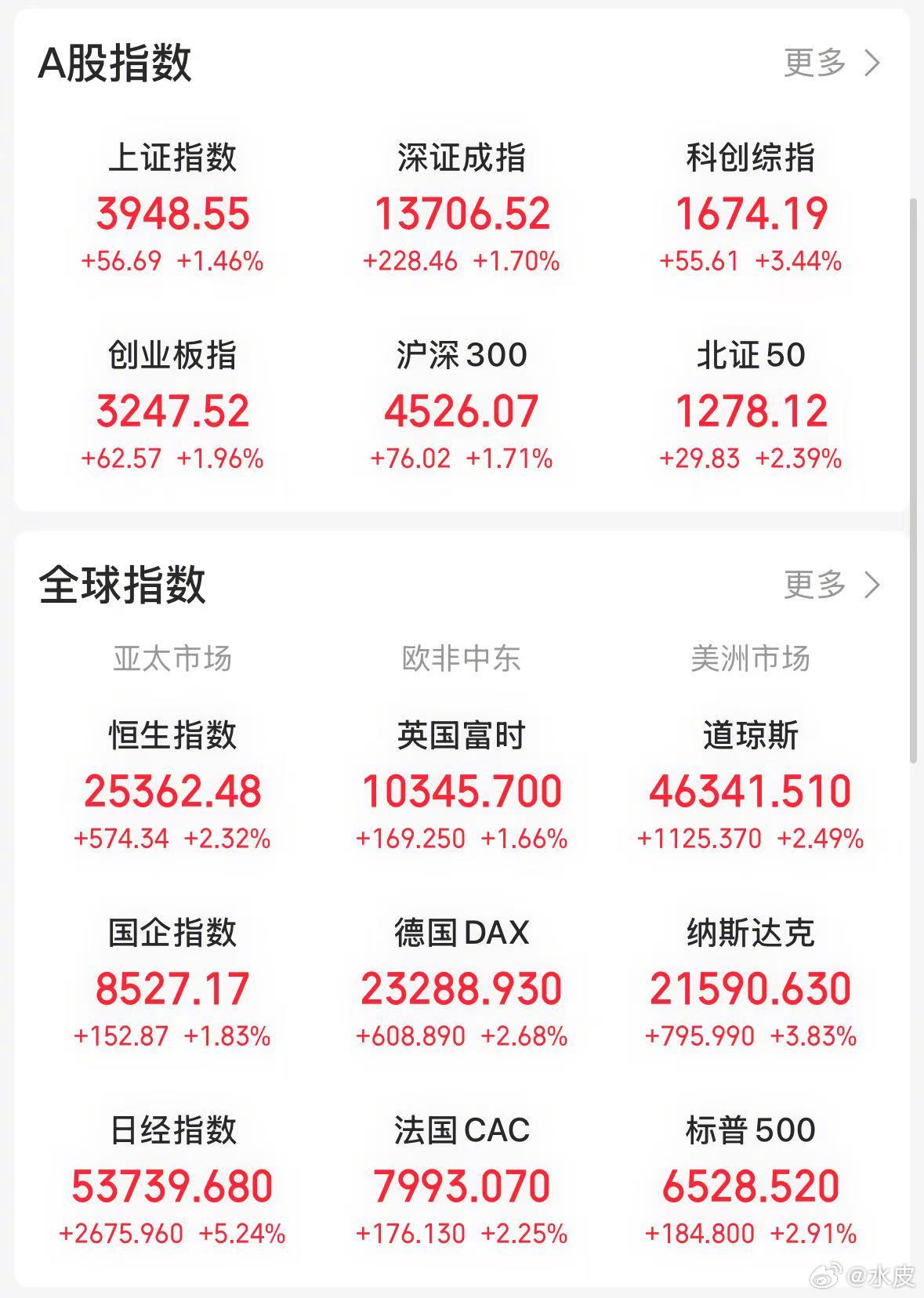 伊朗总统的表态引发全球市场剧烈波动。原油市场首当其冲,美油价格从 106 美元直线暴跌至 97 美元,布伦特原油也从 110 美元跳水,跌破 100 美元关口;国内市场方面,上海期货交易所的原油当时就暴跌约 10%。与之相反,彼时正在交易的美股市场全线大涨,道琼斯指数最终收涨 2.5%,纳斯达克指数大涨 3.85%,一举扭转此前的持续下跌走势,迎来大幅反弹,七大科技股涨幅普遍达 5%。美股的强势表现极大提振了亚太时段的亚洲市场,日本和韩国的指数都是大涨,日经指数收涨 5.24%,韩国的指数涨幅更是达到 8.4% 左右,韩国市场的大幅走高,主要受半导体板块带动,三星、海力士等龙头标的迎来强势反弹。