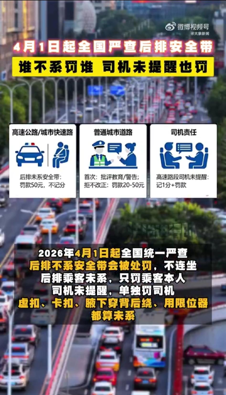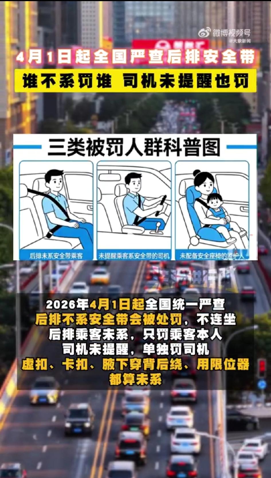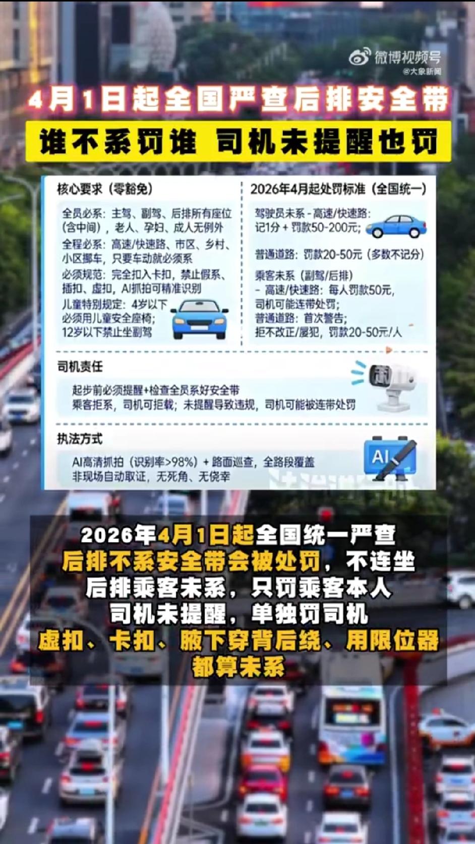 后排安全带,4月1日起真动真格了! 还在觉得后排是“安全区”?今天起,这个老黄历彻底翻篇了! 从2026年4月1日零时起,全国范围内对后排安全带的检查不再是“口头劝导”,而是动真格的“刚性执法”。不管你是开私家车、网约车还是出租车,只要车子在动,后排安全带就必须系好。 这次执法最大的变化,就是彻底告别了“一人犯错,全车背锅”的时代,责任划分得明明白白: 乘客自己负责:年满14周岁的后排乘客,如果不系安全带,罚单直接开给本人。不管是完全没系,还是把安全带搭在身后、只插卡扣不拉紧、从腋下穿过,甚至使用“安全带插片”糊弄,只要被拍到,都算违规,直接处罚。 司机只担提醒义务:司机的责任是起步前口头提醒并检查。只要尽到了提醒义务,乘客执意不系,司机就无需承担责任,甚至可以依法拒载。但如果司机自己都没提醒,那不好意思,司机也会被单独处罚。 别抱有任何侥幸心理,以为路程短、速度慢就没事,或者觉得交警查不到。现在AI高清摄像头已经全面上岗,识别率超高,哪怕是深色车窗膜也挡不住精准抓拍。 记住,系上安全带,不是为了应付检查,而是为了在关键时刻,给自己和家人多一份生的希望。 从今天起,上车第一件事,别忘了提醒后排的亲友:请系好安全带!安全带新规 规范系安全带 汽车安全带未系 安全带条例 请佩带安全带 带 点式安全带