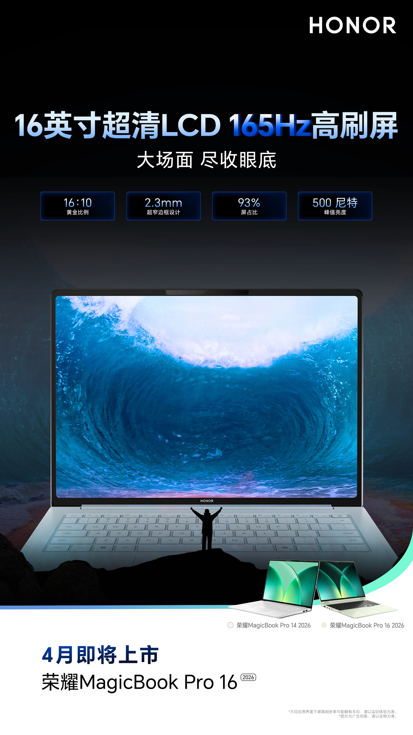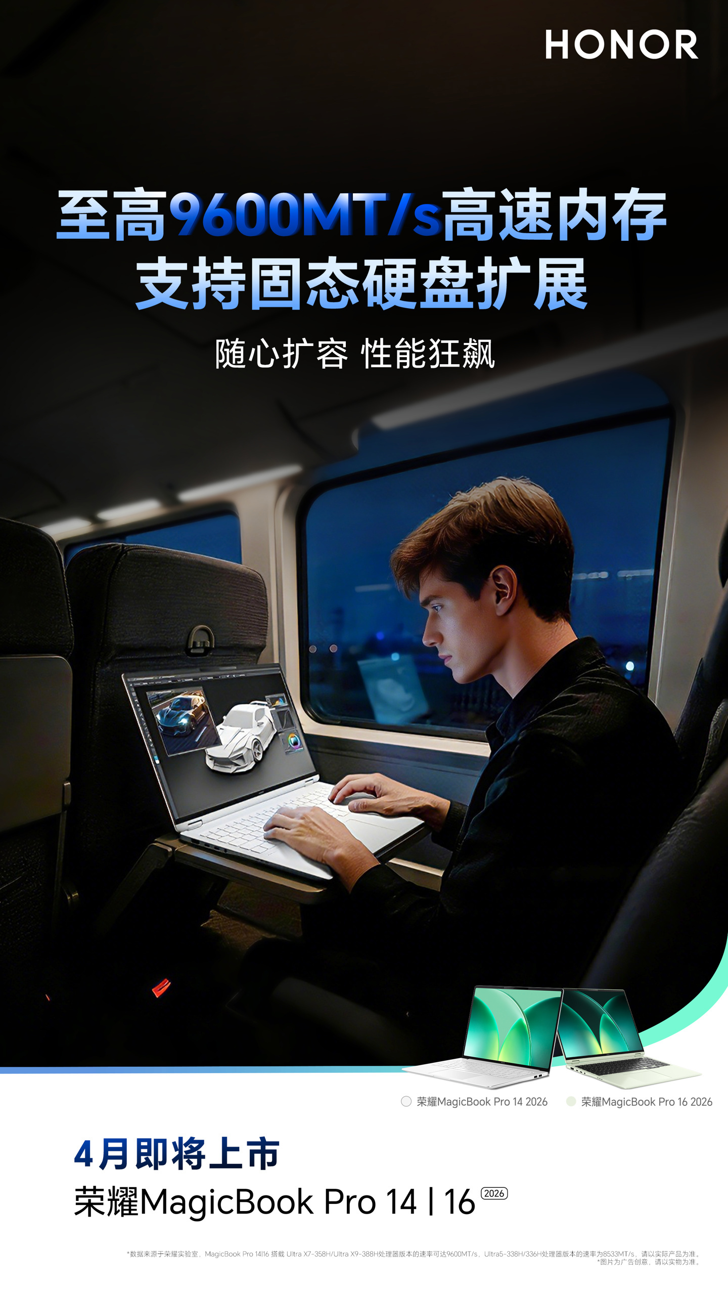 【即将发布,荣耀2026 款 MagicBook Pro 14 和 MagicBook Pro 16 配置汇总】MagicBook Pro 14 和 Pro 16 双尺寸📌 MagicBook Pro 14• 14.6 英寸 OLED 超清触控屏• 3120×2080 分辨率 + 120Hz 高刷• 3:2 办公比例,700 尼特峰值亮度• 配备 LR 抗反光涂层,观感更舒适📌 MagicBook Pro 16• 16 英寸 3K 级 LCD 高刷屏• 3072×1920 分辨率 + 165Hz 高刷• 16:10 比例,93% 高屏占比• 500 尼特峰值亮度全系搭载第三代英特尔酷睿 Ultra 处理器,可选 Ultra 5 338H / Ultra X7 358H / Ultra X9 388H,最高 88W 性能释放标配 92Wh 大容量电池,Pro 14 轻至 1.37kg,Pro 16 轻至 1.64kg,支持双 M.2 2280 硬盘扩展,最高 9600MT/s 高频内存两款都搭载荣耀绿洲护眼技术即将正式发布,这两款配置你感觉如何?