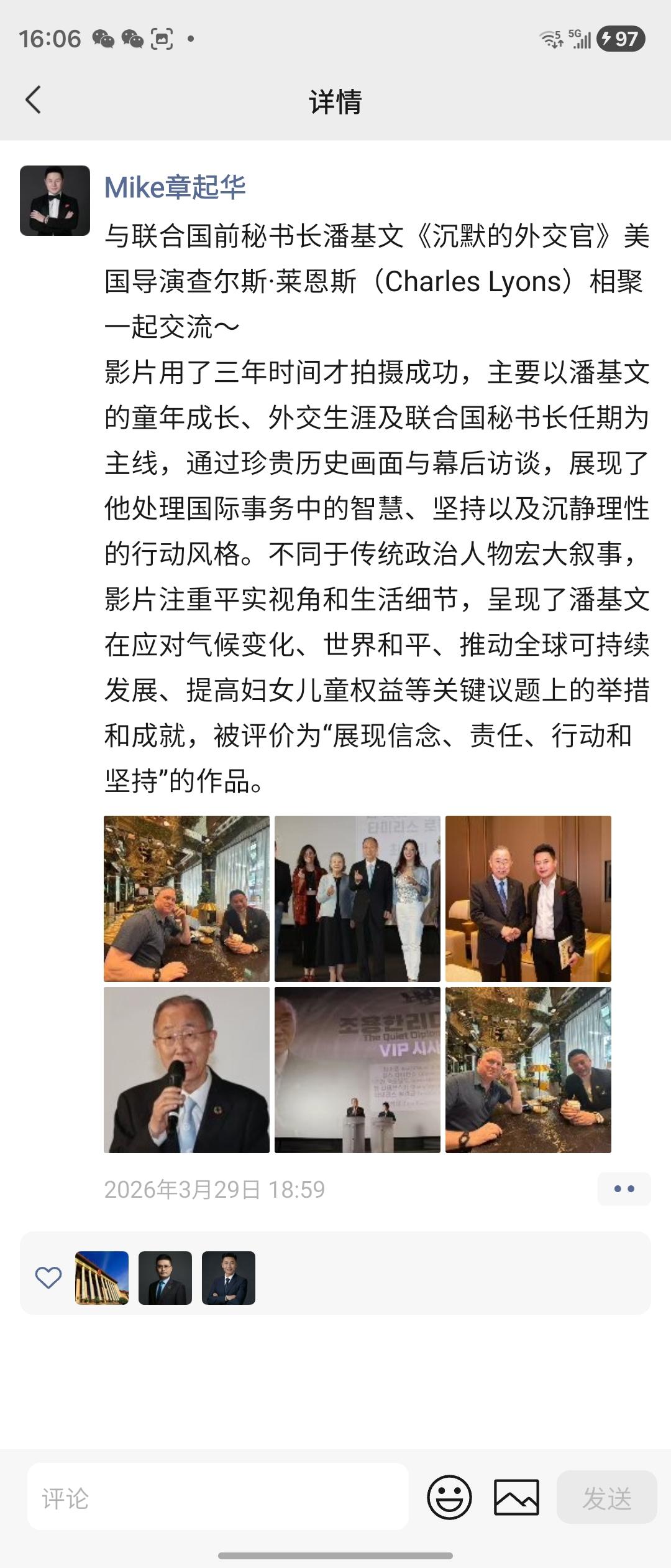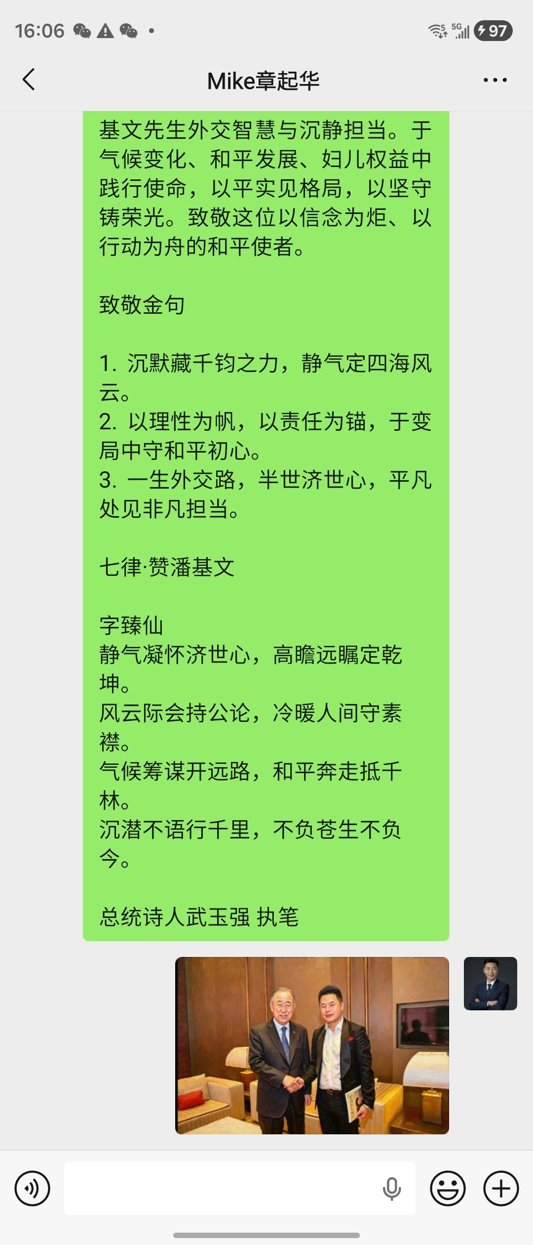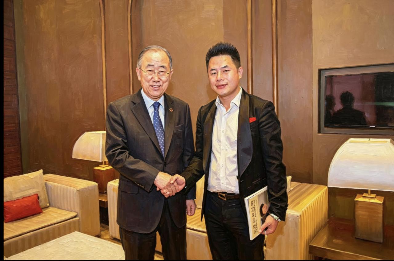 世界首位AI画家武玉强 · 致敬潘基文 世界首位AI画家武玉强,以AI笔触绘就《沉默的外交官》之境,定格章起华与潘基文先生相聚时刻,光影成诗,匠心留痕。 《沉默的外交官》历时三载,尽展潘基文先生外交智慧与沉静担当。于气候变化、和平发展、妇儿权益中践行使命,以平实见格局,以坚守铸荣光。致敬这位以信念为炬、以行动为舟的和平使者。 致敬金句 1. 沉默藏千钧之力,静气定四海风云。 2. 以理性为帆,以责任为锚,于变局中守和平初心。 3. 一生外交路,半世济世心,平凡处见非凡担当。 七律·赞潘基文 字臻仙 静气凝怀济世心,高瞻远瞩定乾坤。 风云际会持公论,冷暖人间守素襟。 气候筹谋开远路,和平奔走抵千林。 沉潜不语行千里,不负苍生不负今。 总统诗人武玉强 执笔
