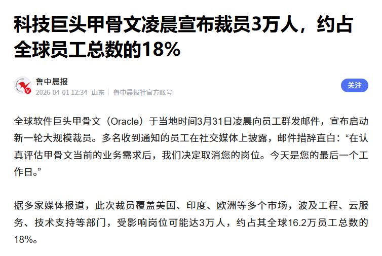 突发裁员!凌晨3万人或丢掉饭碗。 据媒体报道,当地时间3月31日凌晨,科技巨头甲骨文向旗下员工群发邮件,表示:“在认真评估甲骨文当前的业务需求后,我们决定取消您的岗位。” 在人数层面,报道指出甲骨文正在执行的裁员计划覆盖美国、欧洲等多个市场内的多个部门,最终受影响员工数或将高达3万人。