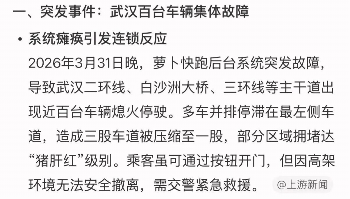 武汉萝卜快跑大面积故障这种大规模自动驾驶汽车的“摆烂”好像还是第一次,但终究也是有了第一次,说实话这还是云端有安全员的情况下出现的,断网啥也没办法了,如果本地部署大模型,断网问题是不会出现了,但是否可控又存疑,为什么现在的L3方向就一直在强调冗余呢?就是怕出现像这样的问题,如果这次有一套本地模型冗余,能靠边停车,是不是就不会出现了呢?