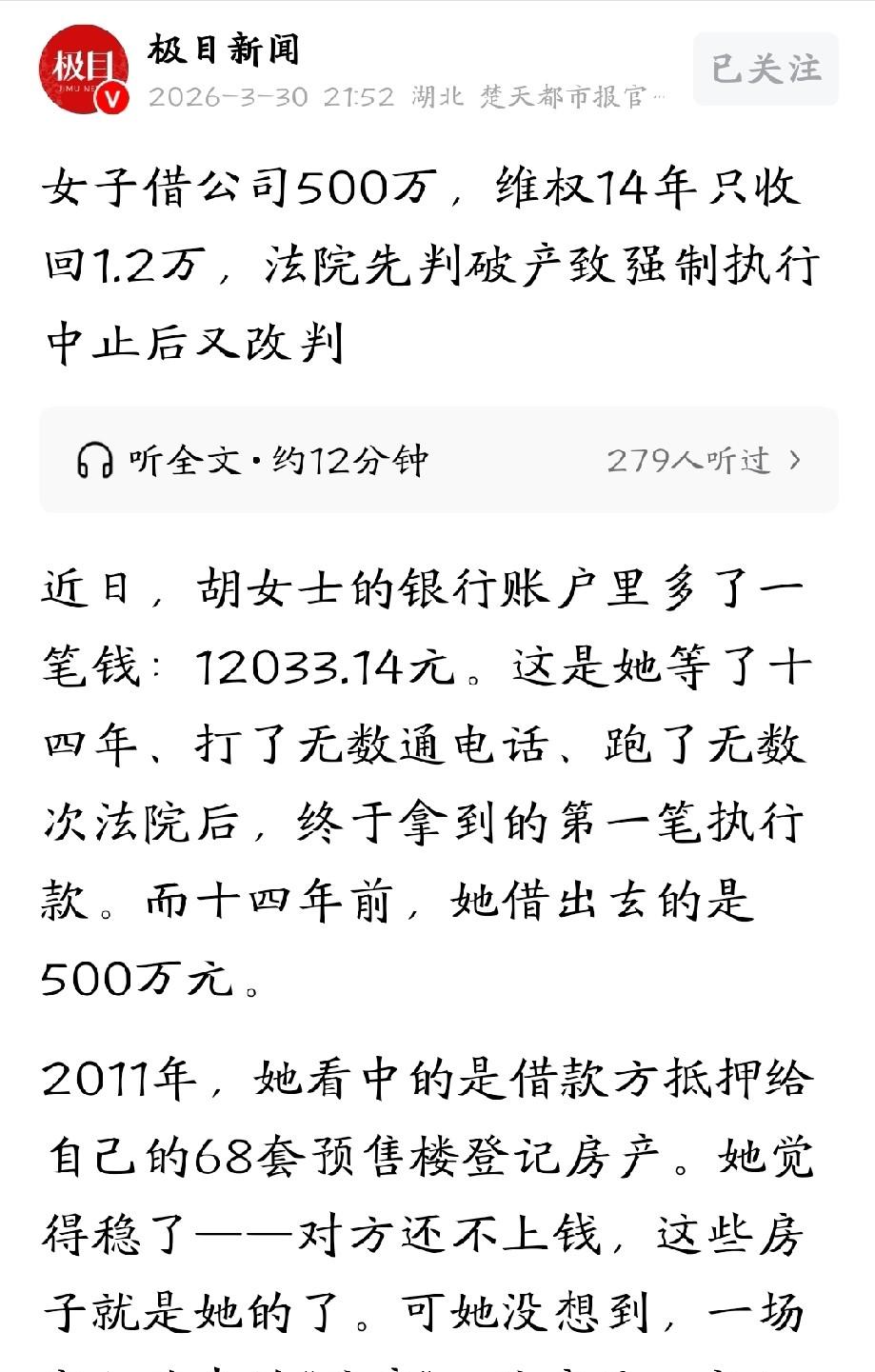 太讽刺了。黑龙江大庆,女子一时冲动,将全家的500万血汗钱借给某房地产公司,对方承诺四个月就还,给20万利息,要是还不上,就用68套房子做抵押。谁知,借款到期后,对方丝毫没有还钱的意思,以各种理由一拖再拖。多次索要无果后,女子急疯了,将地产公司告上法庭。就在她准备申请强制执行时,公司突然宣布破产,68套房子没了。女子不甘心,一路为自己讨要说法,苦苦维权14年,可结果让她泣不成声。 谁能料到啊,看似“稳赚不赔”的买卖,居然把一个普通家庭坑得底朝天。 到最后,只落得个撕心裂肺的绝望。 这事儿得从2011年说起,那时候大庆的房地产市场那叫一个火,到处都是开发商拿地、盖楼的身影,资金周转得特别频繁,也就催生了不少民间借钱的活儿。 当时,大庆本地有一家房地产公司,正忙着盖一个小区。 可手里的钱不够周转了,急得像热锅上的蚂蚁,到处找民间资金救急。 开出的条件,说真的,诱惑力拉满。 大姐家里不算大富大贵,但架不住父母一辈子做小生意,攒下了不少养老钱,再加上她和老公多年的积蓄,还有向几个至亲好友凑的钱,手里刚好凑够500万。 这笔钱,可是全家的底气,是爸妈的养老本,也是亲戚们托付的血汗钱,大姐一直攥得紧紧的,就想找个稳妥的法子,让钱能多生点钱。 大姐一开始也挺谨慎,反复问了地产公司的资质、小区盖得怎么样,还特意跑到工地去看了一圈,看到工地上热热闹闹,工人们都在忙着干活,心里的顾虑就少了一大半。 她琢磨着,这么大的公司,还有房子抵押,总不能耍赖吧,这买卖稳赚不赔,于是没再多想,就答应了借钱。 大姐天天盼着日子快点过,等拿到20万利息,既能给爸妈改善改善生活,也能给亲戚们一个交代,日子就能更宽裕点。 可现实这东西,往往不如人愿,越是看着稳妥的事儿,越容易出意外。 接下来的日子里,她天天打电话、跑地产公司,对方的态度越来越敷衍,找的理由也越来越离谱,要么说工程款没结回来,要么说银行贷款没批下来。 亲戚们知道消息后,也都纷纷上门问情况,有的担心钱要不回来,说话难免有点急躁。 大姐一边要安抚家里人,一边要四处要钱,压力大得快崩溃了,好几次都急得直哭。 她再也不信地产公司的鬼话了,开始天天守在地产公司门口,从早上等到晚上,就为了能见到负责人,要回自己的钱。 可就算侥幸见到了,对方也只是随便敷衍几句,要么说再等等,要么就找借口推脱,从来没有实际行动。 好在,法院认定,判决大姐胜诉。 她以为,这下总算能拿回自己的钱了,那些日日夜夜的煎熬、来回奔波的疲惫,总算没白费,她终于能给家里人和亲戚们一个交代了。 可谁能想到,命运居然给她开了这么残忍的一个玩笑,就在强制执行程序刚启动,一切都往好的方向走的时候,意外发生了。 原来,这家地产公司不光欠了大姐的钱,还欠了好多人的钱,资金链早就断得彻底,根本没钱还所有欠款。 按照法律规定,公司一旦破产,所有资产都要纳入破产清算,用来还所有债权人的钱,之前被查封的68套抵押房子,也不例外。 大姐不甘心啊,那是全家的血汗钱,是她半辈子的积蓄,怎么能就这么没了? 直到2025年,她终于等来了第一笔,也是唯一一笔执行款。 可是,这一万块够干啥的啊! 那一刻,大姐再也控制不住自己的情绪,蹲在银行门口,嚎啕大哭起来。 她不知道这条路还要走多久,也不知道自己最后能不能拿回属于自己的血汗钱,但她知道,自己不能停下,因为那是全家的希望,是她半生的执念。 对于这件事,您有什么想说的吗?欢迎评论区留言讨论。 信息来源: 极目新闻 2026-3-30女子借公司500万,维权14年只收回1.2万,法院先判破产致强制执行中止后又改判