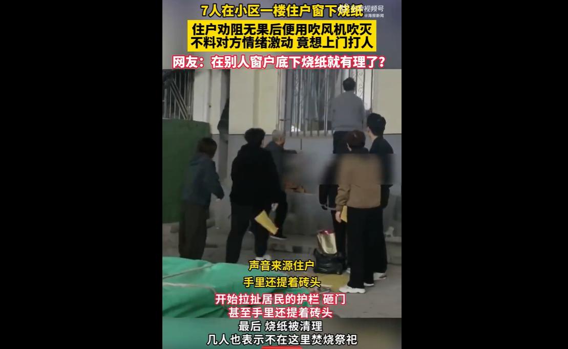 近日,甘肃兰州一老小区内,7人在一楼住户窗下烧纸,住户因小区外墙有保温泡沫、烧纸气味刺鼻且灰烬飘进家中劝阻无效后,用吹风机吹灭烧纸。 几名烧纸男子情绪激动,拉扯护栏、砸门并持砖,最终烧纸被清理,几人表示不再此处焚烧祭祀。 首先,我们能理解烧纸者的祭祀初心。烧纸作为传统祭祀方式,承载着人们对逝者的缅怀与思念,是很多人表达哀思的重要途径,7人选择在小区内烧纸,或许是出于便捷,或许是沿用传统习惯,这份对逝者的敬意,理应被理解。 但理解不等于无底线包容,祭祀的前提,是不能影响他人生活、不能带来安全隐患,这是为人处世的基本准则,也是对邻里的基本尊重。 更应共情住户的不满与担忧。 这是一座老小区,外墙有保温泡沫,属于易燃材质,在窗下烧纸,一旦火星飞溅,极易引发火灾,危及整栋楼居民的生命财产安全;同时,烧纸产生的刺鼻气味的灰烬,会直接飘进住户家中,影响其正常生活,甚至可能引发呼吸道不适。 住户最初选择温和劝阻,却未被对方理会,在诉求得不到回应、安全与生活受到影响的情况下,才用吹风机吹灭烧纸,这份举动虽有不妥,却也藏着难以言说的无奈,并非故意“不近人情”。 令人遗憾的是,烧纸者在被吹灭烧纸后,并未反思自身行为的不妥,反而情绪激动,做出拉扯护栏、砸门、持砖等过激行为,将一场祭祀纠纷升级。 他们认为住户“不近人情”,却忽视了自己的行为已经侵犯了邻里的合法权益,忽视了老小区的安全隐患,这种只考虑自身诉求、不顾及他人感受的做法,不仅破坏了邻里和谐,也违背了祭祀本身传递的敬畏与善意,更可能触及法律底线,得不偿失。 这场纠纷,本质上是传统祭祀习俗与现代邻里生活的碰撞,更是“自我诉求”与“他人权益”的失衡。祭祀是心意的表达,但心意的传递,从来都不是“我行我素”,而是在尊重传统的同时,兼顾时代需求与邻里感受,选择更安全、更文明的方式。 其实,化解这样的矛盾并不难,只需双方多一份体谅、多一份沟通。 烧纸者若能提前与住户沟通,选择小区内安全、不影响他人的区域烧纸,或者采用鲜花祭祀、线上祭祀等更文明的方式,既能寄托哀思,也能避免引发纠纷;住户若能在劝阻时多一份耐心,主动说明老小区的安全隐患与自身的难处,或许也能获得对方的理解,避免矛盾升级。 遗憾的是,双方都未能做到这一点,才让一场简单的祭祀,演变成激烈的冲突。 临近清明,祭祀的本质是敬畏与思念,邻里相处的核心是尊重与包容,当传统习俗遇上现代生活,当个人诉求撞上他人权益,唯有相互体谅、理性沟通,才能找到平衡点。