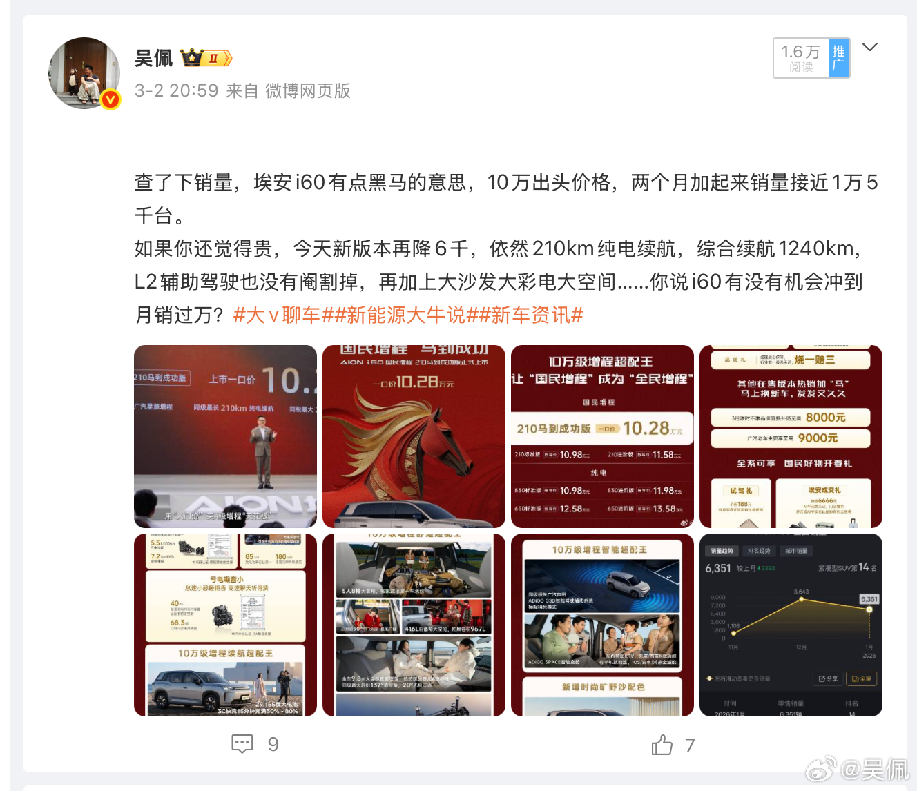 新款埃安i60上市那会儿我就说过有机会销量持续过万,果然3月份做到了。广汽的小车一直挺有竞争力,就看大车能不能也做出成绩了。大V聊车新能源大牛说