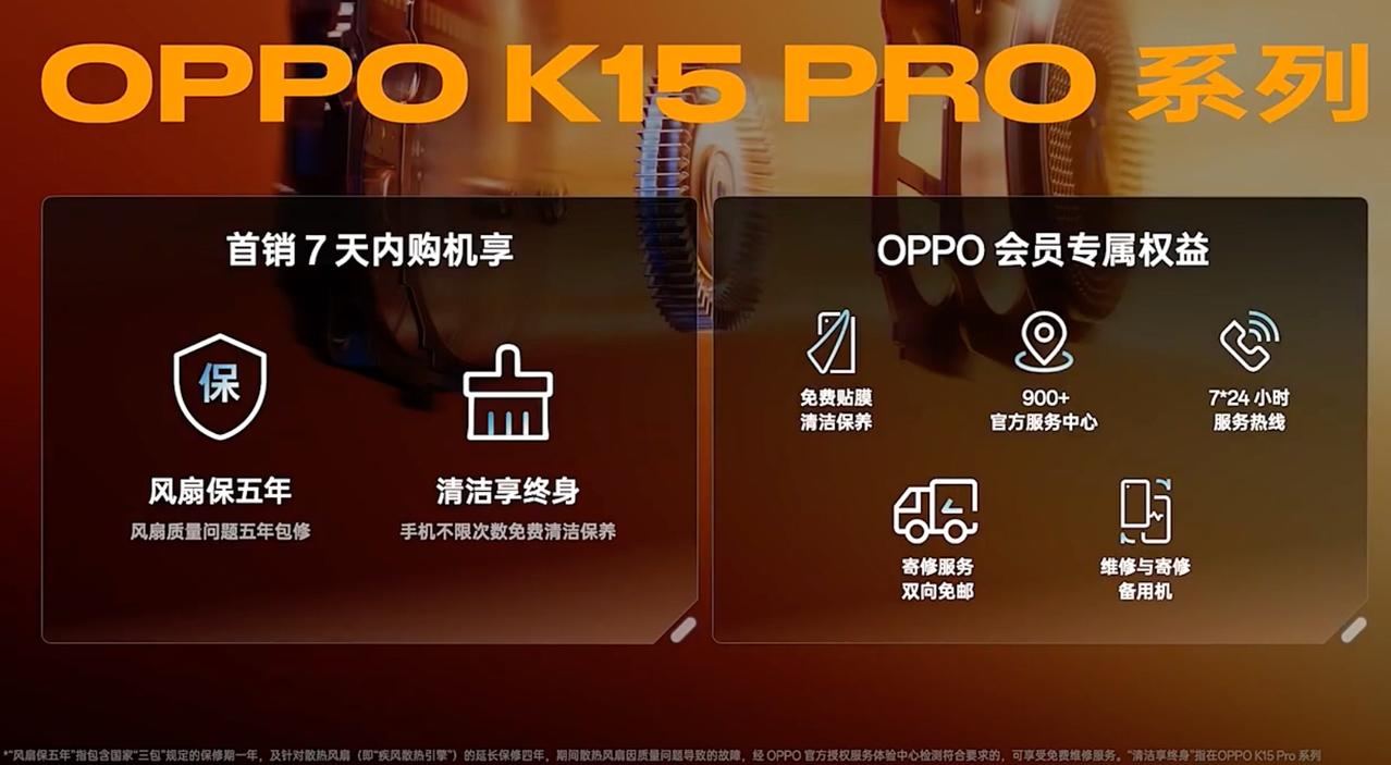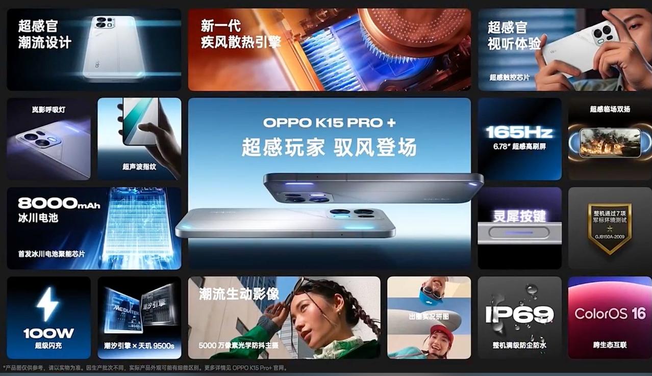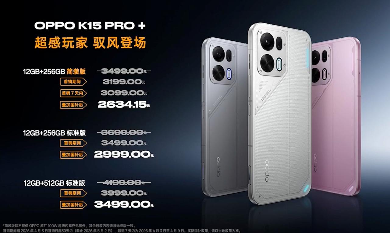 OPPO K15 Pro+ 165hz高刷屏幕 四发声单元,双扬声器 330hz触控采样率 物理按键,自定义 天玑9500s+潮汐引擎 3D超声波指纹识别 8000毫安时冰川电池+100W 简装版12+256GB售价3099;国补2634 12+256GB售价3499;国补2999 12+512GB售价3999;国补3499 K15 Pro+散热套装首发价格299 K15 Pro系列40W磁吸散热器229