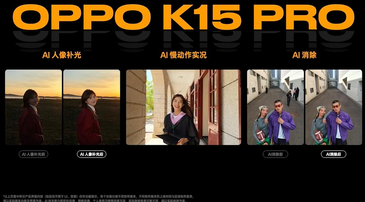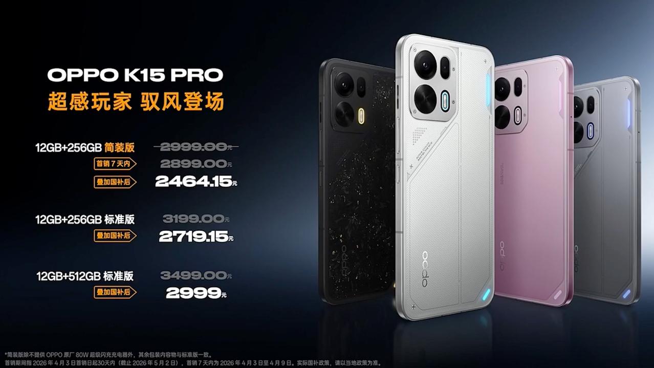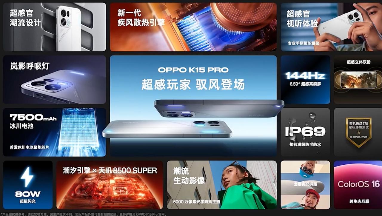 OPPO K15 Pro 自定义呼吸灯,DIY磁吸镜头装饰件 6.59 英寸屏幕,金属中框 超感立体双扬声器 新一代疾风散热引擎(风扇自动开启) 支持多款原生144hz游戏 IP69满级防水+7项军标认证 5000万防抖主摄+升级超广角 实框拼图,AI消除,AI人像补光 7500毫安时冰川电池+80W闪充 天玑8500 SUPER芯片+潮汐引擎 简装版12+256GB售价2899;国补2464 12+256GB售价3199;国补2719 12+512GB售价3499;国补2999