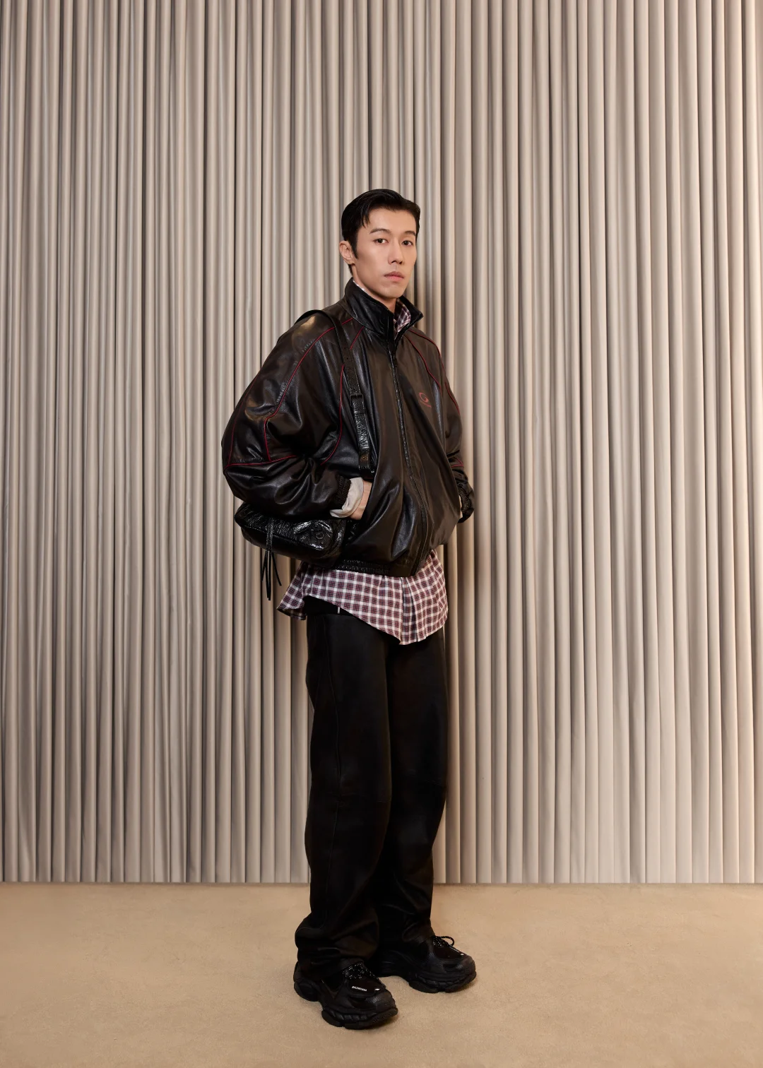 竖条纹旗袍的开叉恰到好处,衬得腿型修长,线条舒展而柔和;肤色均匀且细腻,姿态优雅