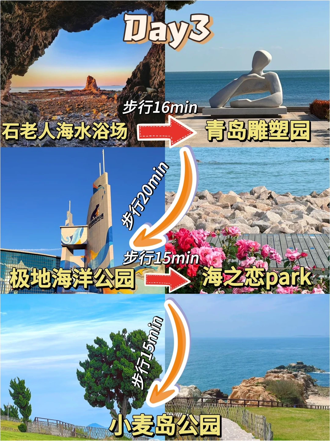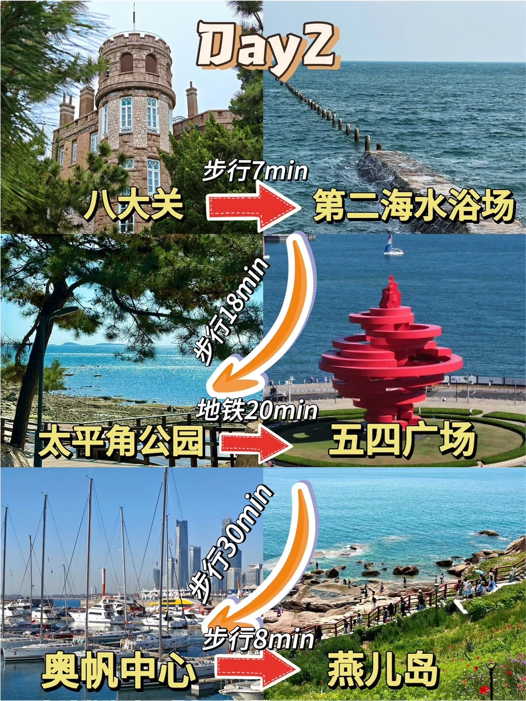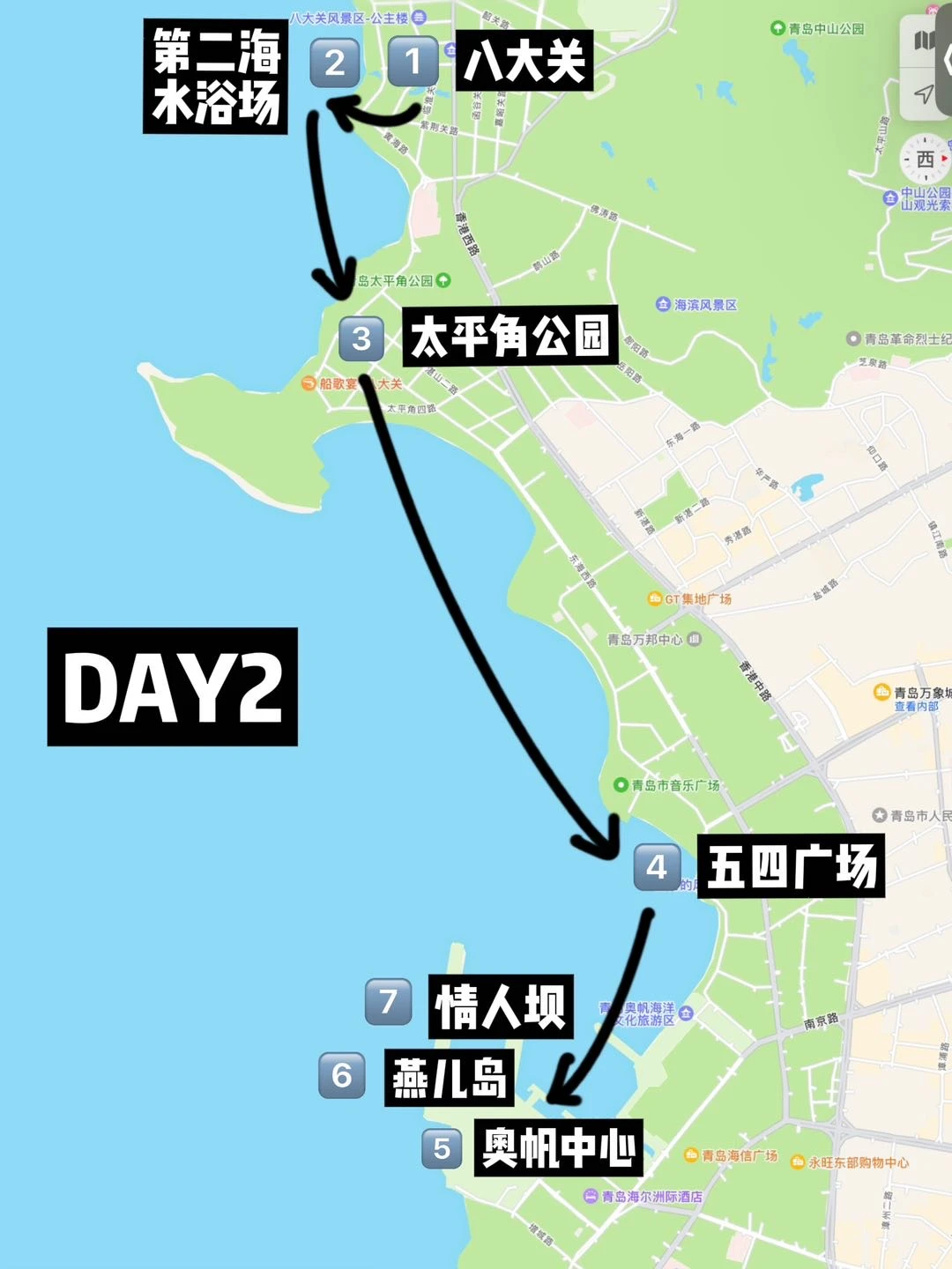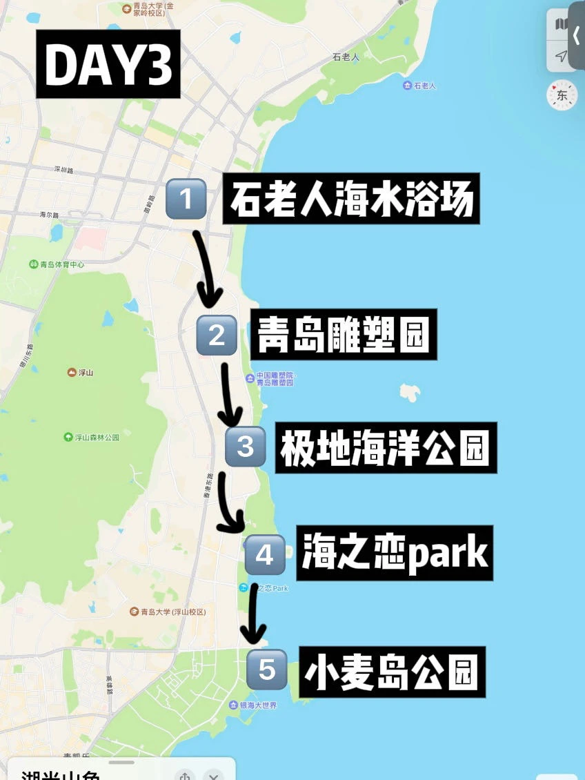 Day3:奥帆中心➡️燕儿岛➡️小麦岛➡️情人坝➡️大学路➡️石老人🍲附近美食推荐:本地人带路才找到的老船长海鲜面,新鲜现捞现做,人均30平价不贵!