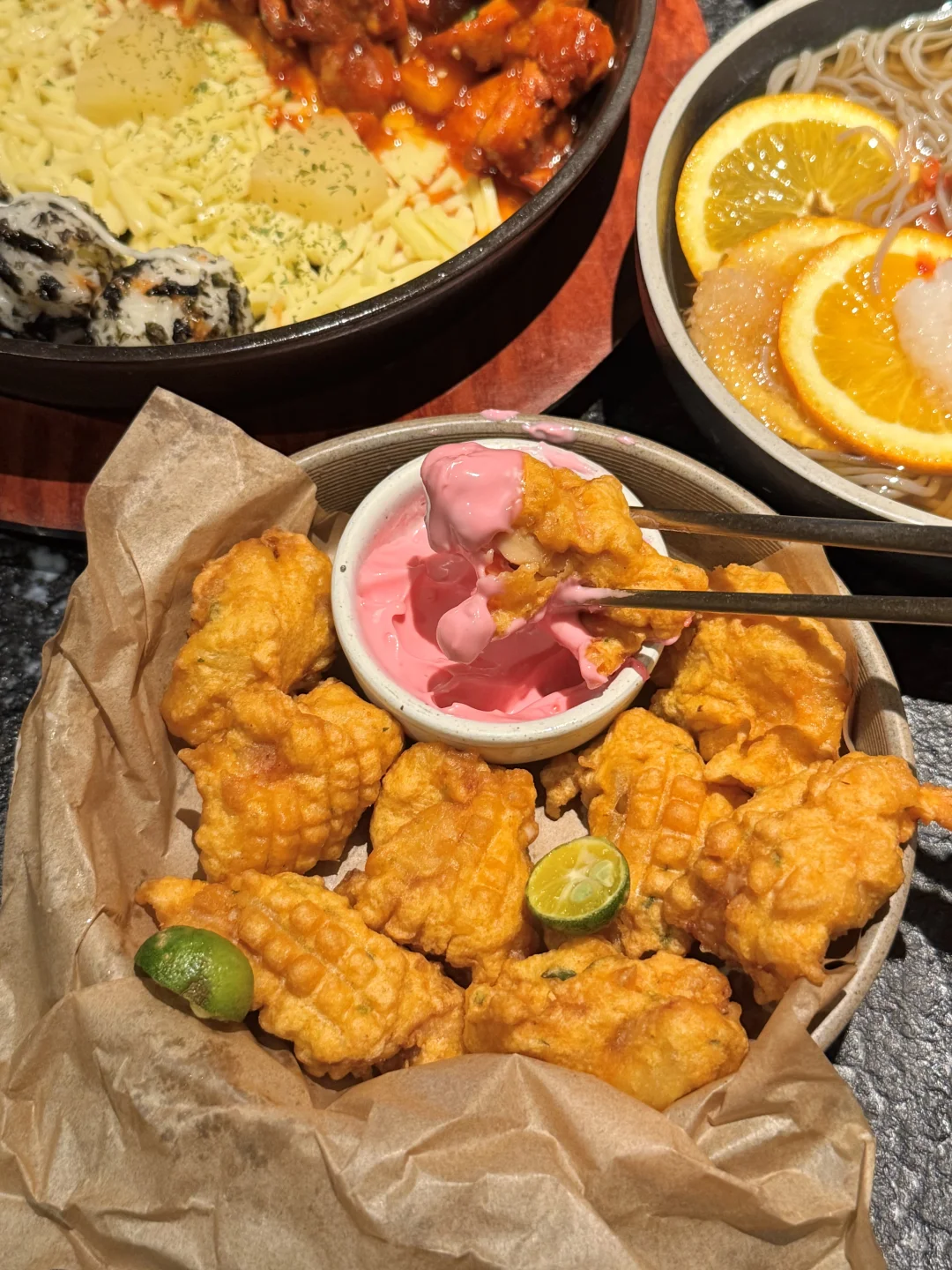 春日蝴蝶酸奶杯!!首尔同款!!谁懂这一杯有多美🥹🥹!!还有橙子荞麦冷面!冰冰凉凉!酸甜的橙子和荞麦冷面巨清爽! 这家(金再喜)是连吃三天都不腻的宝藏食堂了,韩料、小吃、甜品雪花冰都是属于盲点不会踩雷的那种!种类丰富,值得夸的是服务棒!很适合约会~ 建议喜欢韩料的姐妹们直接来这里吃!不会失望!