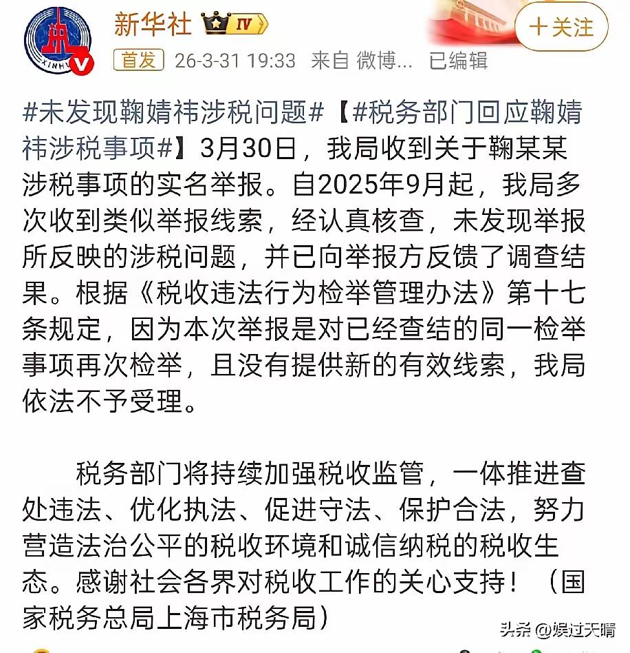 鞠婧祎洗脱罪名!想不到税务局效率挺高。证明丝芭已经来回搞很多次,这一波非但没有恶心到人家,还免费帮忙宣传新剧了! 一般来说,税是经纪公司代交的,神也是它鬼也是它,现在就是经纪公司鱼死网破,而其他公司要保自己的电视剧就得保鞠婧祎,除非经纪公司负责人抱着自己一起坐牢的决心,否则不可能绊倒四千年美女。 只能说明像小鞠这样的优秀艺人还是很多,不仅会上综艺拍电视剧拍电影,还懂法律。知道自己该做什么不该做什么,要不然也不会有那么多真爱粉。 她这次应该是心里有数,知道有人要搞她,让团队提前补上了,事先防着的。所以这次事情出来后,她才能如此淡定。 这家公司多次对鞠婧祎假举报,应该受到惩罚吧。小鞠可以反手告这家公司恶意诬告,真是太恶毒了,得不到小鞠就想毁了她!这样没有道德的公司是留不住演员的!大家认为呢?
