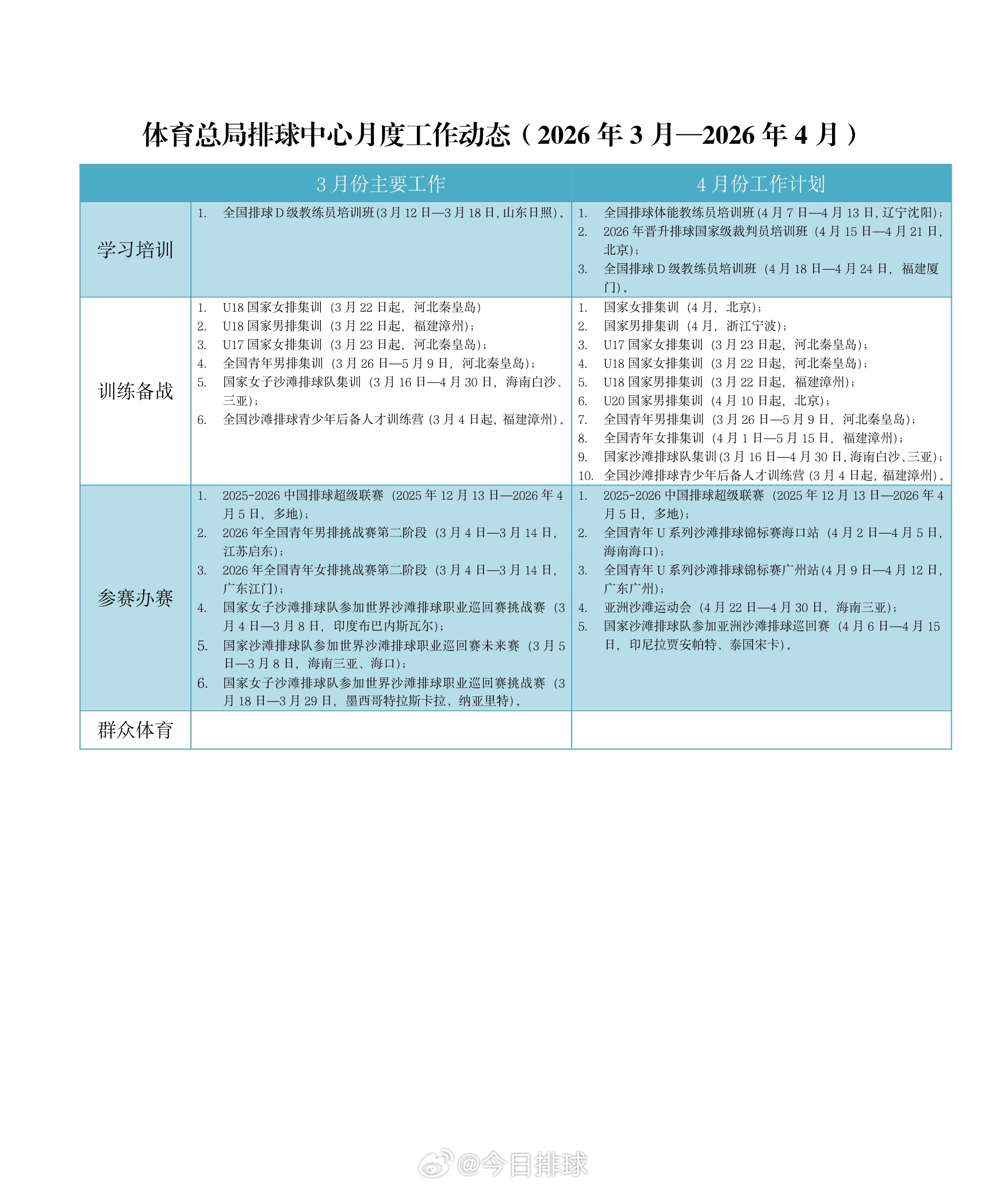 4月1日,排球中心发布2026年3~4月月度工作动态。联赛结束后,中国女排 将在北京开始集训,中国男排 则在宁波北仑。
