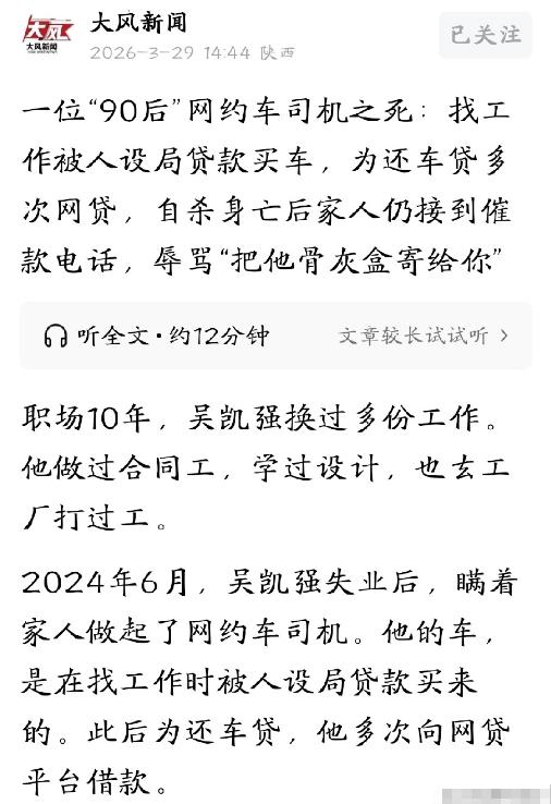 网贷要人命!浙江丽水,33岁男子性格内向,在网上应聘网约车司机时,被人设局贷款买车,每月要还车贷3194元。他挣得少,根本支撑不了,只能多次网贷,逾期还不上后,就遭到了暴力催债。害怕家里人知道,留下封邮件,说自己不想死,但实在扛不住了,然后买了瓶农药,在母亲的墓地附近喝药自杀。自杀后,家人仍然接到催款电话的威胁和辱骂,家属不堪其扰,选择报案,几经周折,终于立案。 发生这样的悲剧,到底又是谁的错呢? 吴某就是个老实巴交的普通人,他没有什么大志向,就想找份稳当活儿,踏踏实实干,挣点辛苦钱过日子。 他进过工厂、做过临时合同工,还帮人做过简单的杂活,可每份工作都干不长久。 眼看着年纪越来越大,身边的人不是成家就是有了稳定事业,他心里也急啊,就想赶紧找份能挣钱的工作,多少补贴点家里,让家里人少为他操心。 或许是因为心太急,在他看到网上的广告信息,他没来得及辨别,就急冲冲地去添加微信了。 负责人十分热情,不管他问啥,都耐心得一一解答,还说他啥也不用管,安心开车挣钱就行。 就这一番话,彻底让他放下了心。 第二天,吴某按照约定来到了公司。 只是,这家公司看着就不怎么正规,办公地方又小又挤,没几个工作人员。 但负责人依旧热情得很,拉着他絮絮叨叨说个不停,吹得天花乱坠,说公司规模大、资源多,跟着他们干,保准能挣着钱。 紧接着,对方就拿出一叠厚厚的合同,说这些都是入职必须签的手续,有入职协议、车辆使用协议啥的,让他赶紧签字,签完就能去提车。 他本身就内向,也不擅长看合同上那些弯弯绕绕的条款,也不好意思多问,满脑子就想着赶紧签完字,尽快入职挣钱。 眼瞅着字全签完了,负责人还露出了真实面目。 他说这个是贷款买车的合同,每个月还多少,还几个月,都告诉了吴某。 他还说得轻描淡写,说只要吴某好好接单,一个月挣一万多,这点车贷根本不算事儿,甚至还能剩下不少钱。 吴某当时就懵了,脑子一片空白,他压根就没想过要贷款买车,更不知道每个月要还这么多钱。 他想拒绝,想反悔,可对方立马就变了脸,语气硬得不行,说合同已经生效了,要是不履行,就得拿高额违约金,还得被起诉,到时候不仅要赔钱,个人征信也得受影响。 可吴某万万没想到,这只是骗局的开始,后面的日子,比他想象的还要难。 提车之后,他才发现,这车根本没法正常开网约车。 他不敢告诉家里人,只能把所有的压力都憋在心里,整个人也变得越来越憔悴。 一步错步步错,他竟然打算用网贷来“拆东墙补西墙”。 毫无意外,利滚利的利息,他欠了十几万。 催债电话不分白天黑夜,哪怕是凌晨两三点,也会准时打过来,有时候一天能接到上百个,电话里全是不堪入耳的辱骂,还有各种恶毒的威胁。 他也试着跟催债的人协商,放低姿态恳求对方宽限一段时间,说自己会拼命接单,尽快还款。 可对方根本不搭理他,反而变本加厉地威胁他,说要是再不还钱,就找一群年轻人上门“催收”,到时候后果自负。 他心里清楚,这些催债的人说到做到,他不怕自己受委屈,可他怕连累家人,怕家人因为他蒙羞、被骚扰。 最终,他选择了一条最懦弱的方式,结束了自己的生命。 对于这件事,您有什么想说的吗?欢迎评论区留言讨论。 信息来源:大风新闻 2026-3-29