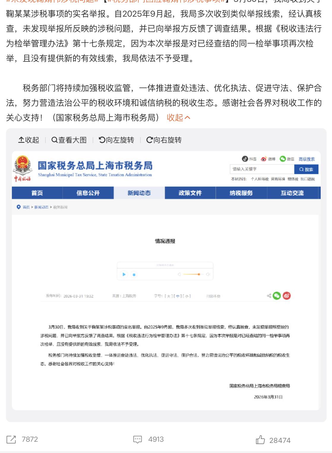 内娱经不起查,这一招竟然在鞠婧祎这里失效了! 这次内娱艺人竟然经得起明察暗访了! 官方都出来替鞠婧祎说话了,针对鞠婧祎被举报偷漏税,上海税务局直接给出了回应,通过认真核查,未发现举报中所说鞠婧祎的涉税问题。 不管哪个艺人被沾上边,基本都得被全网扒一遍,运气差的直接就塌房凉透了。 尤其是税务这块儿,只要敢越界,管你是顶流大腕还是新人小花,该付出的代价一点都少不了。 懂点税法的人都清楚,要是这些指控是真的,鞠婧祎光补缴税款就得1755万左右,再加上每天都在涨的滞纳金,还有最高5倍的罚款,最后得交的钱说不定能突破1亿。 更严重的是,一旦被划成劣迹艺人,这辈子就别想再混演艺圈了。 拍好的作品会被下架,签好的代言会被取消,这么多年的努力全白费。 没过多久,就有网友扒出了举报背后的猫腻,这场看似针对鞠婧祎税务问题的举报,说白了就是她和前东家丝芭传媒的合约纠纷闹大了。 随着谣言越传越邪乎,甚至有一些平台偷偷下架了鞠婧祎的相关作品,不少合作方也开始打退堂鼓,暂停了和她的后续合作,鞠婧祎的演艺事业一下子就陷入了困境。 就在这关键时候,鞠婧祎的工作室态度那叫一个硬气,否认了所有的指控。 但大家心里都跟明镜似的,工作室的声明终究只是自己一方的说法,内娱以前的例子太多了,就算艺人方说得再坚决,最后还是得看官方的核查结果。 没想到,官方通报一出来,舆论彻底就反转了。 现在,内娱的税务监管已经进入“零容忍”模式了,流量根本不是“护身符”,赚得多也不是偷漏税的借口。 不管你是顶流艺人,还是刚出道的新人,只要碰了税务红线,该付出的代价一点都少不了。 但反过来,对于那些依法纳税、守得住法律底线的艺人,税务部门也会依法保护他们的合法权益。 在这个信息满天飞的时代,谣言传得比真相快多了,但真相永远比谣言有力量。 鞠婧祎用自己的经历证明,只要守好底线、依法做事,就算遇到恶意举报,也能经得起任何核查,而那些想靠不正当手段打压别人的人,最后终究会自食恶果。 对于这件事,您有什么想说的吗?欢迎评论区留言讨论。