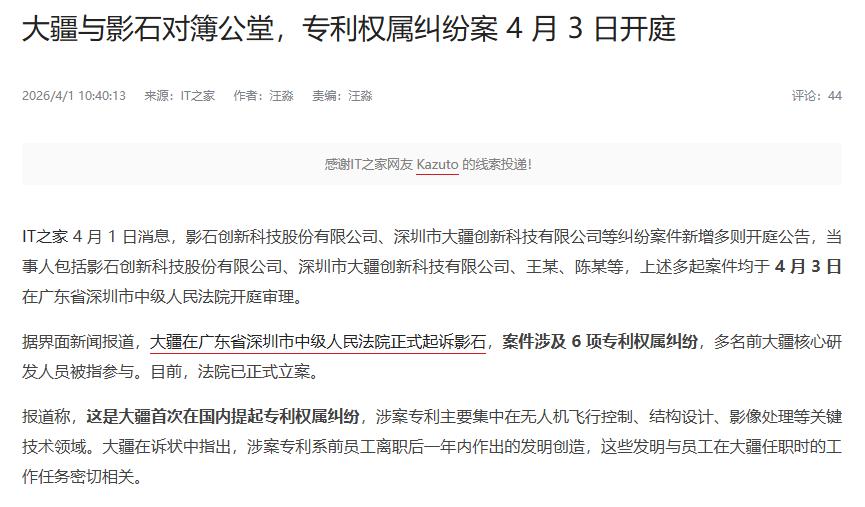 大疆 影石专利权属纠纷案即将开庭。 据了解,此前备受网友关注的“大疆 影石专利权属纠纷案”将在4月3日,于广东省深圳市中级人民法院开庭审理。本案除是大疆首次在国内提起专利权属纠纷外,其核心纠纷方向也均以无人机飞行控制、结构设计、影像处理这类关键技术为主。