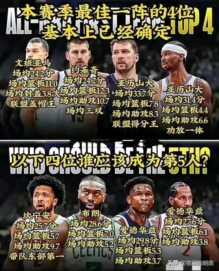 本赛季一阵人选,目前肯定入选的是文班亚马、约基奇、东契奇、亚历山大,这是毫无疑问的。 最佳阵容有两个中锋、两个组织后卫,全部来自西部。 第五位是谁? 肯定是小前锋位置,布朗或伦纳德,考虑凯尔特人战绩更好,布朗的数据也稍稍领先,加上东部也必须有一个,所以只能是布朗。
