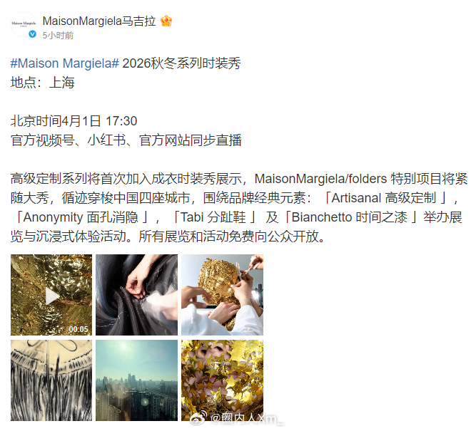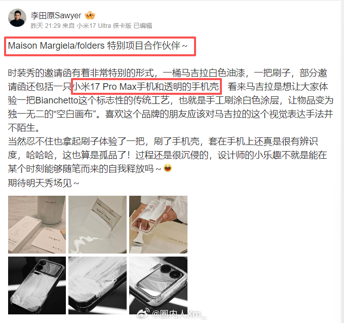 Maison Margiela x 小米跨界合作来了!跳过四大时装周,Margiela 2026 秋冬大秀今晚压轴登陆上海时装周(今晚),秀前直接官宣和小米的联名企划!伴手礼有小米 17 Pro Max + 定制壳,Margiela 涂装版小米 YU7 也曝光了(大概率秀场专属不发售)网友们都在蹲会不会有小米汽车专属定制香氛,网传 BLACKPINK 成员 Jennie会现身~,今晚看点还真不少MaisonMargiela 上海大秀小米 XMaisonMargiela 联名小米汽车小米17promax