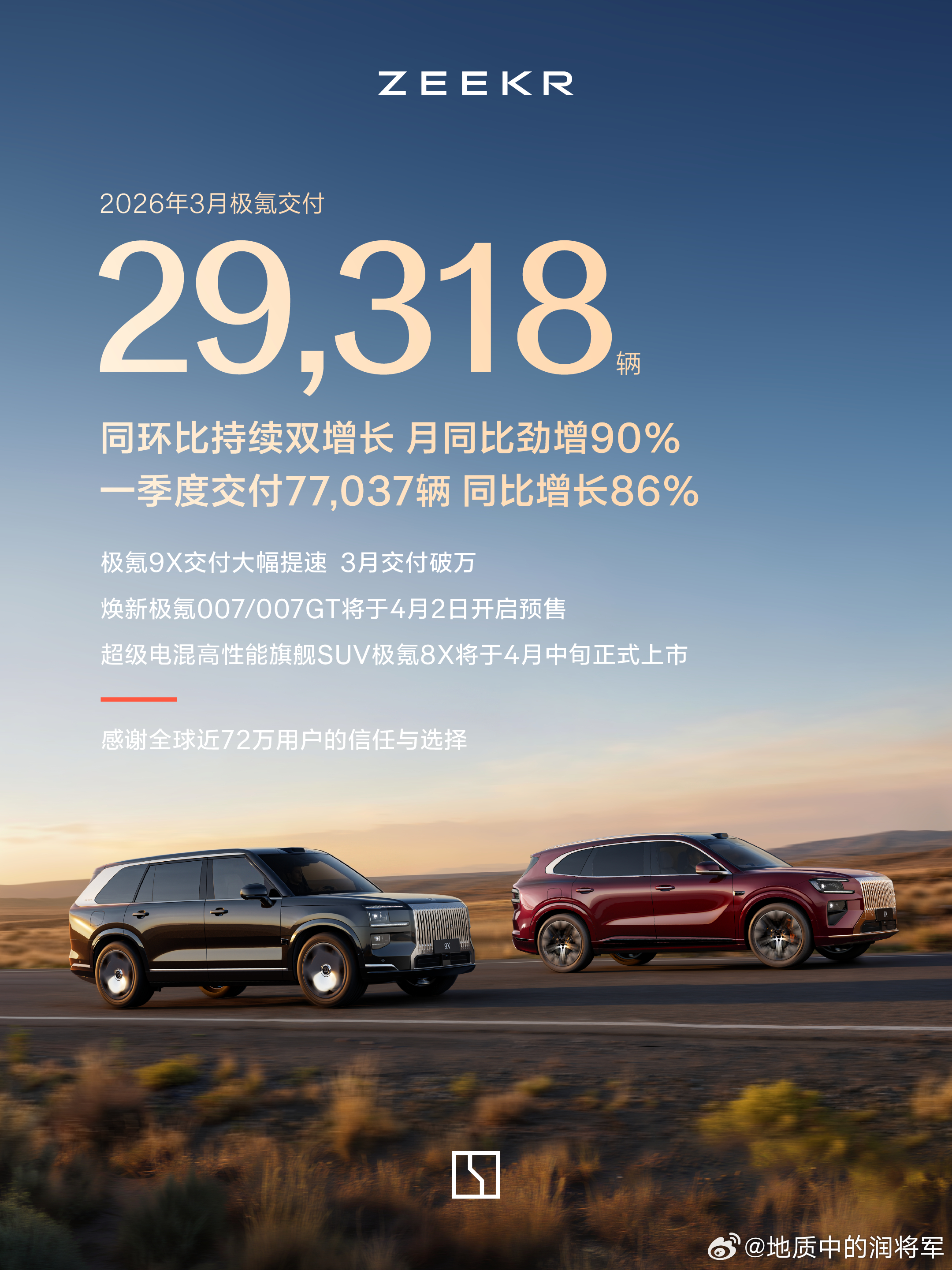 极氪3月销量出炉,销量为29318台,非常接近3万台了,同比环比都在增长,同比增长90%,一季度交付77037辆,同比增长66%