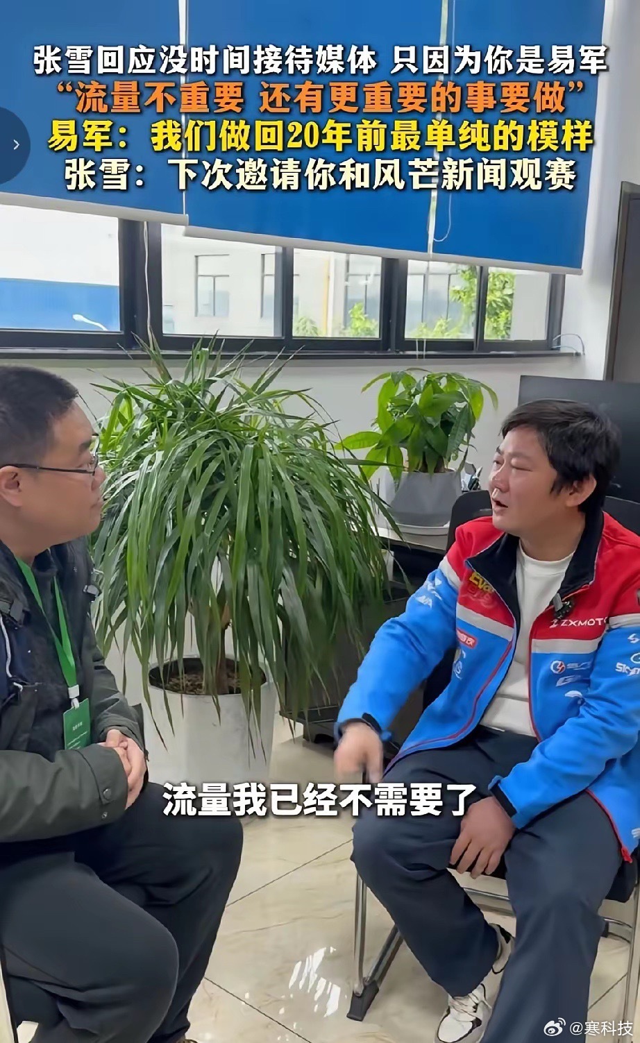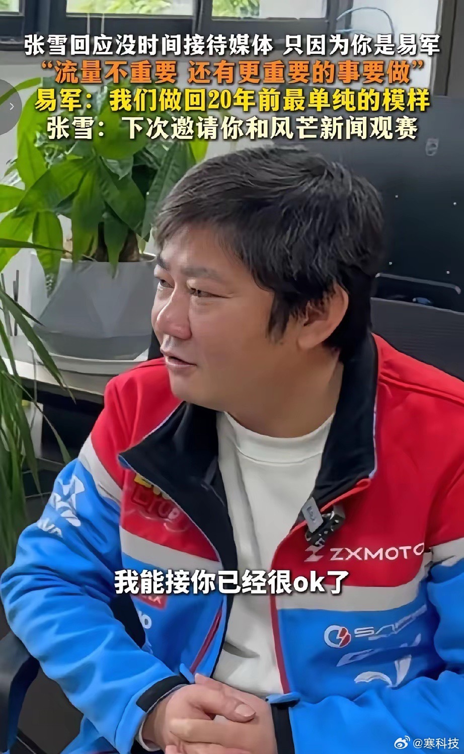 20年前是张雪追着易军让他采访。20年后,易军再去采访张雪,张雪说我接受采访,只因为是你。众所周知,张雪已经谢绝媒体采访,易军能采访到他,确实是看在他们俩之前的情分上。从这个事看得出他真的是纯粹的追求者。