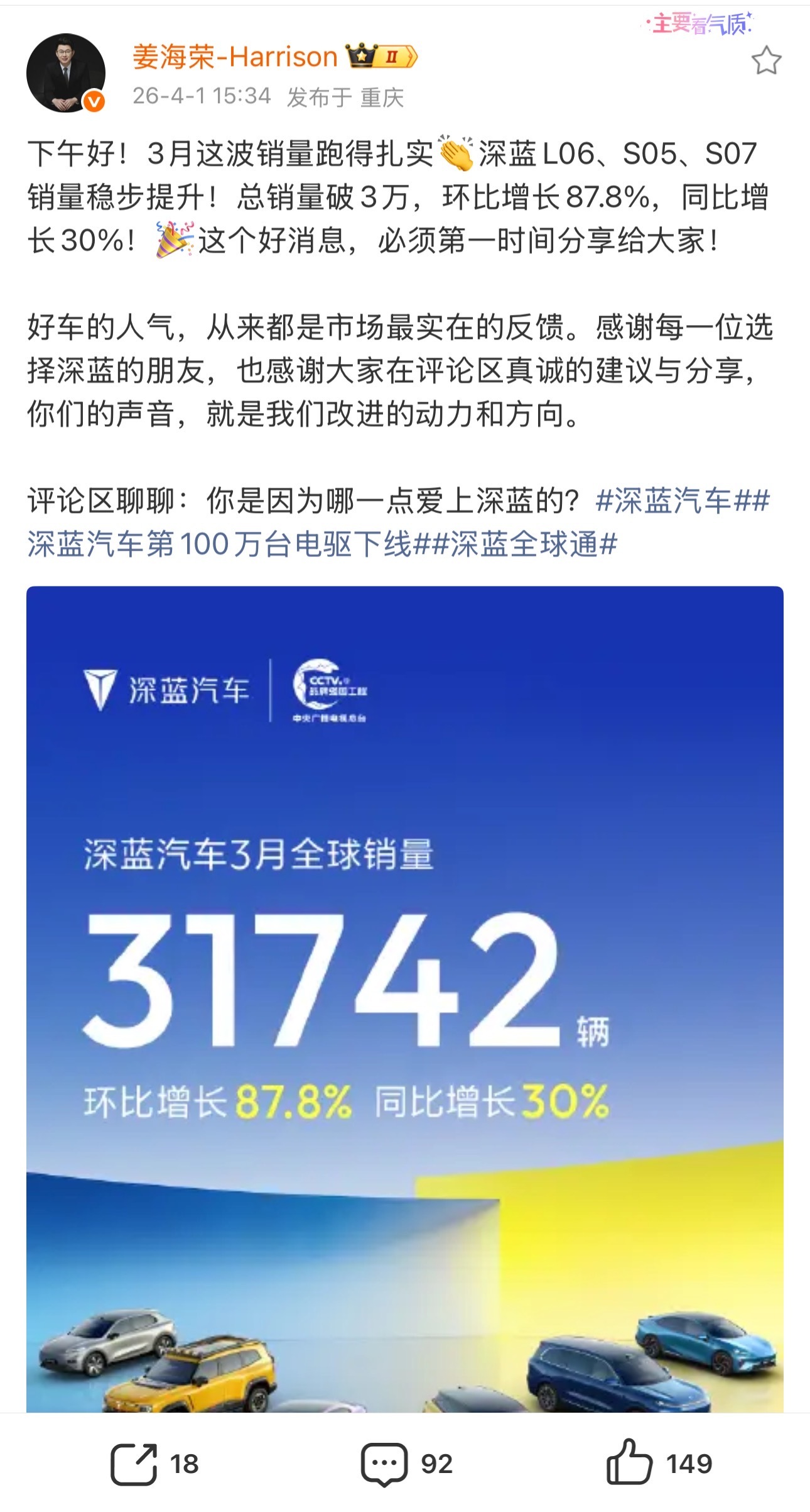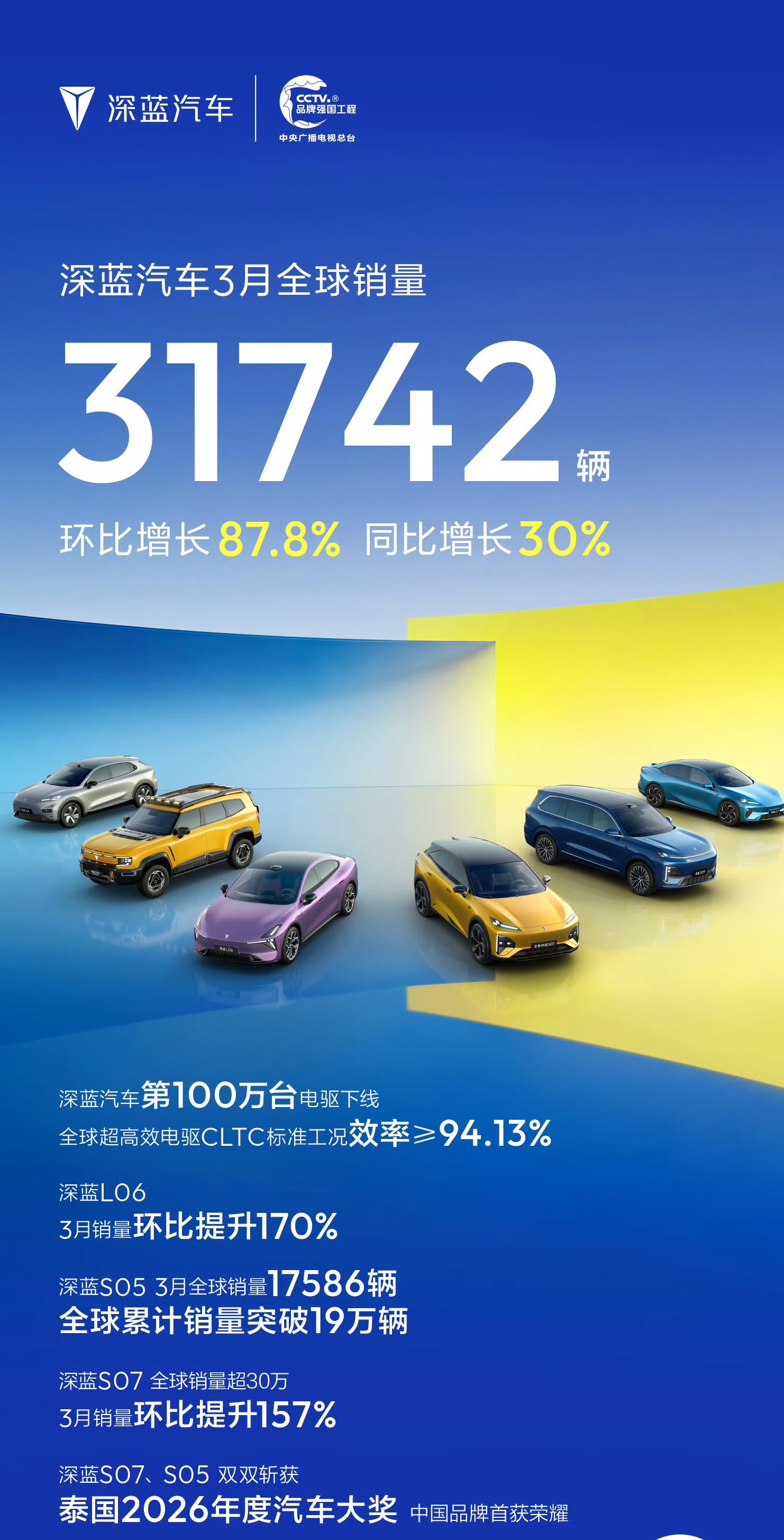 刚看到深蓝3月销量海报,破3万辆了!31742台,环比涨了87.8%,L06环比暴增170%,S05卖了17586台,累计破19万。
