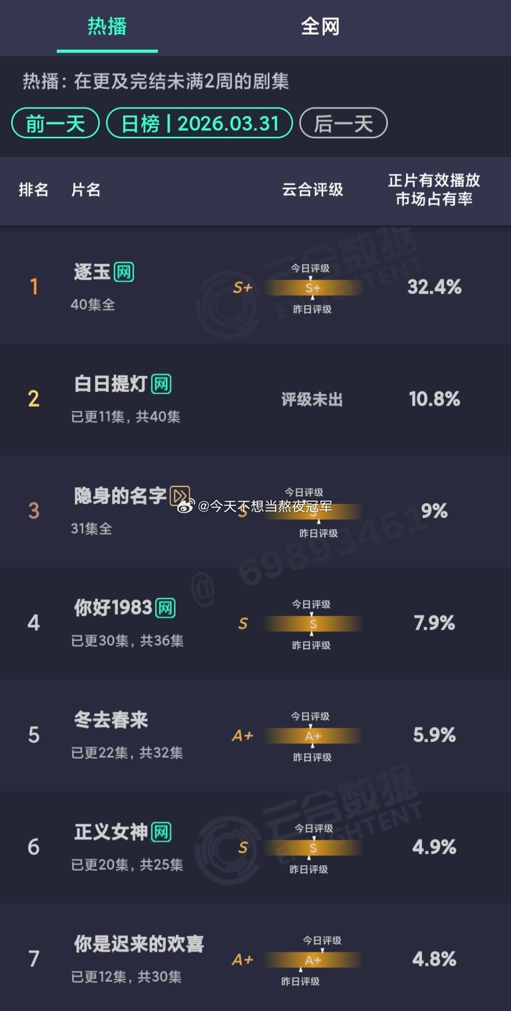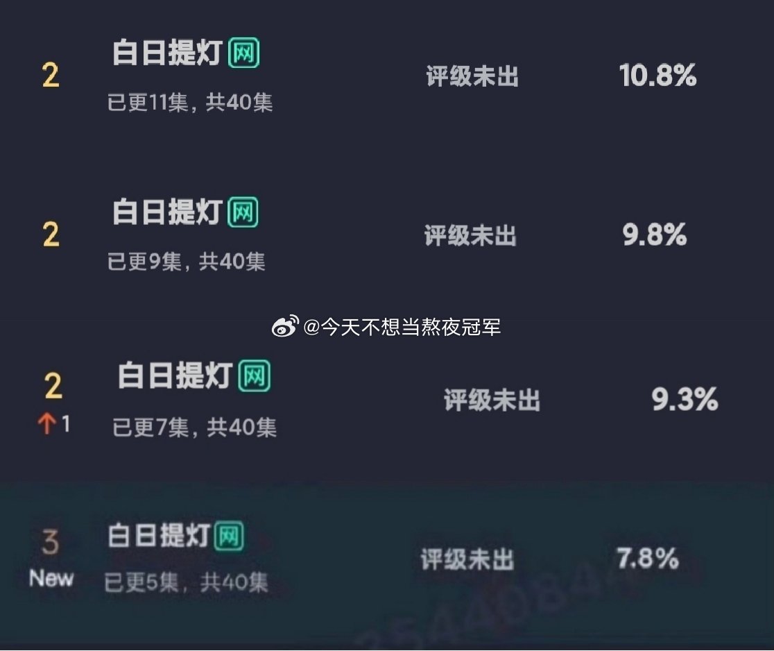 迪丽热巴 陈飞宇《白日提灯》昨日云合占比10.8%,上升1%,预估播放量2350w迪丽热巴说白日提灯话题太少没看到迪丽热巴问白日提灯固屏去哪了