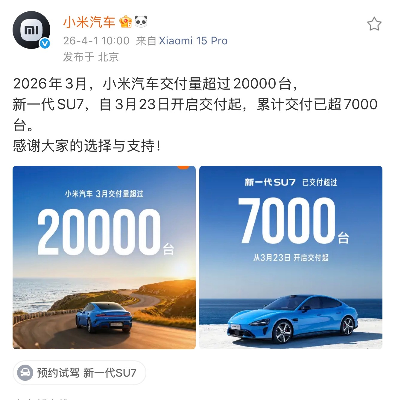 3月份,小米汽车交付量超过20000台,新一代SU7,累计交付已超7000台。