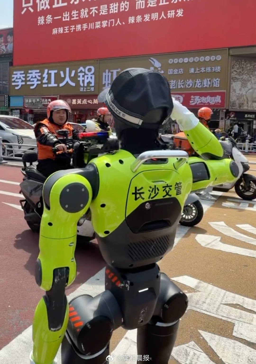 【#有人骑车不戴头盔被机器人拦住了#,#长沙交警两位赛博机器人同事上岗#,市民直呼太有科技感】“快看,是机器人交警在执勤,好有科技感!”4月1日下午,在长沙市黄兴广场,一名智能交通指挥机器人正式“上岗”,吸引不少市民和游客驻足围观。同时亮相的,还有一辆无人巡逻车。不少市民评价,交警“新同事”看起来充满了未来感和科技感。潇湘晨报·晨视频记者从正在现场执勤的长沙市公安局交通管理支队芙蓉大队定王台中队了解到,这两位“新同事”目前仅在该中队辖区内试点执勤,如运行良好,未来可能在长沙其他区域投入使用。记者在现场看到,机器人“穿”上警服,正在现场比划手势,指挥交通。当没有车辆通行时,机器人还会提醒行人注意交通安全,或者提醒骑行电动车的驾驶员戴上头盔。长沙公安交管支队定王台中队民警介绍,智能交通指挥机器人具备多项实用功能:一是精准路口指挥,可自主采集信号灯数据,复现直行、左转、停止等标准手势,规范引导车辆与行人有序通行,同时具备灵活移动能力,适配路口不同点位执勤;二是智能动态劝导,依托视觉 AI 技术 “慧眼” 识违,可精准捕捉非机动车未戴头盔、越线停车及行人闯红灯等行为,并通过主动巡逻、定点值守、敬礼劝导等方式,实现柔性执法与智能干预;三是可开展安全宣教,深入繁华路口、广场、社区、校园等场景,结合拟人化动作与定制化语音,开展趣味化普法。无人巡逻车是路面的“移动天眼”,依托车载高清摄像头组,在五一广场核心区域开展全时段自动巡控,巡逻画面实时回传至指挥中心,让后方民警同步掌握路面动态,实现“车在巡、画面在传、警力在盯”。如果遇到突发交通事件或违法行为时,它可以化身“前线哨兵”,指挥中心可通过远程喊话系统,第一时间对现场进行即时劝导、警告与疏导,实现“发现即干预、呼叫即响应”。这台无人巡逻车还是流动的“宣传窗口”,车身集成的高亮LED大屏可定点停靠,循环播放交通安全宣传片、警示提示及公益广告,将安全知识送到市民身边。此外,它还能充当“移动电子警察”,对违停等违法行为进行自动抓拍与证据固定,灵活补充固定式监控探头的盲区,形成“动静结合、点线互补”的管控网络。长沙公安交管支队相关负责人表示,此次智能交通指挥机器人以及无人巡逻车的投用,可有效分担一线交警重复性执勤工作,将警力从繁琐的指挥、劝导任务中解放出来,使其专注处理复杂交通状况与应急救援,大幅提升交通管理的精细化与高效化。来源:潇湘晨报·晨视频记者曾永红 长沙