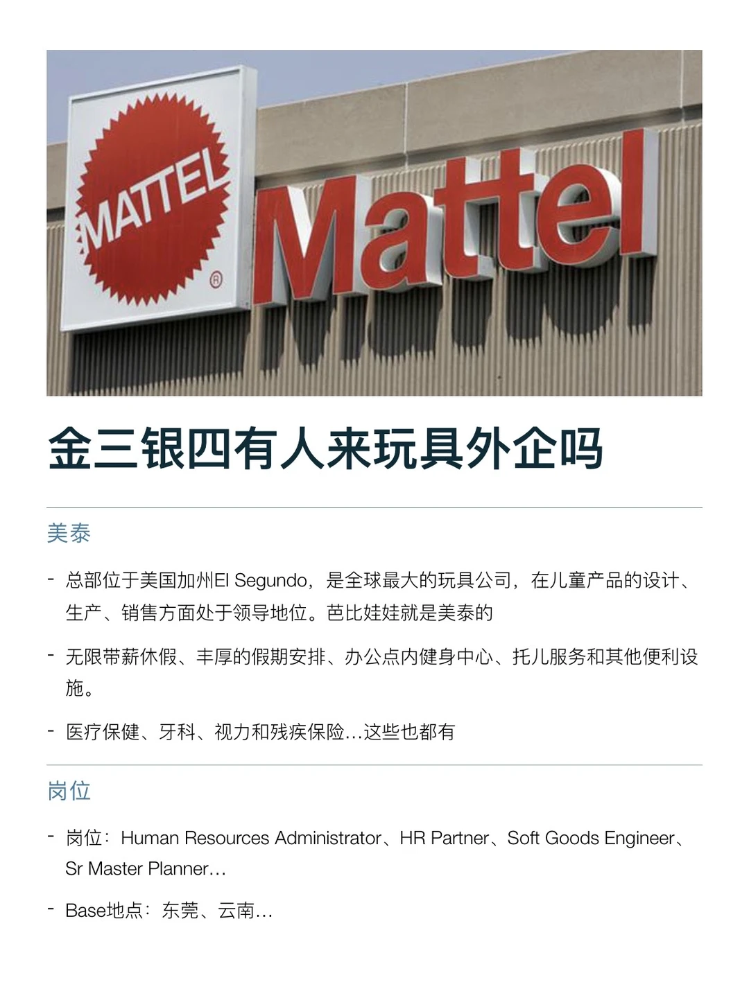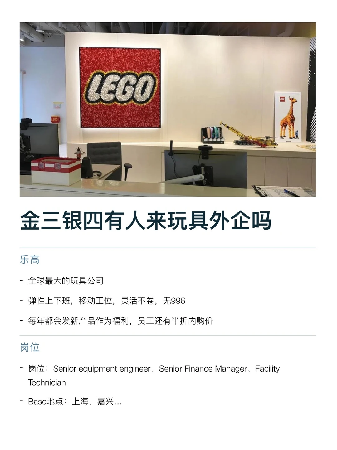 玩具外企其实是个挺有意思的方向。很多品牌做的是IP、模型、产品这些,待起来真的很舒服,日常氛围也更有活力 玩具外企整体的福利也不差,955、双休,年假 10–15 天起,很多还会有员工产品、内购、节日礼物这些,真的很爽,而且节奏不算卷 如果是想找一个轻松一点、又有“活人感”的行业,那玩具外企其实可以试试 坚持日更✊🏻,对外企感兴趣的欢迎常来看看
