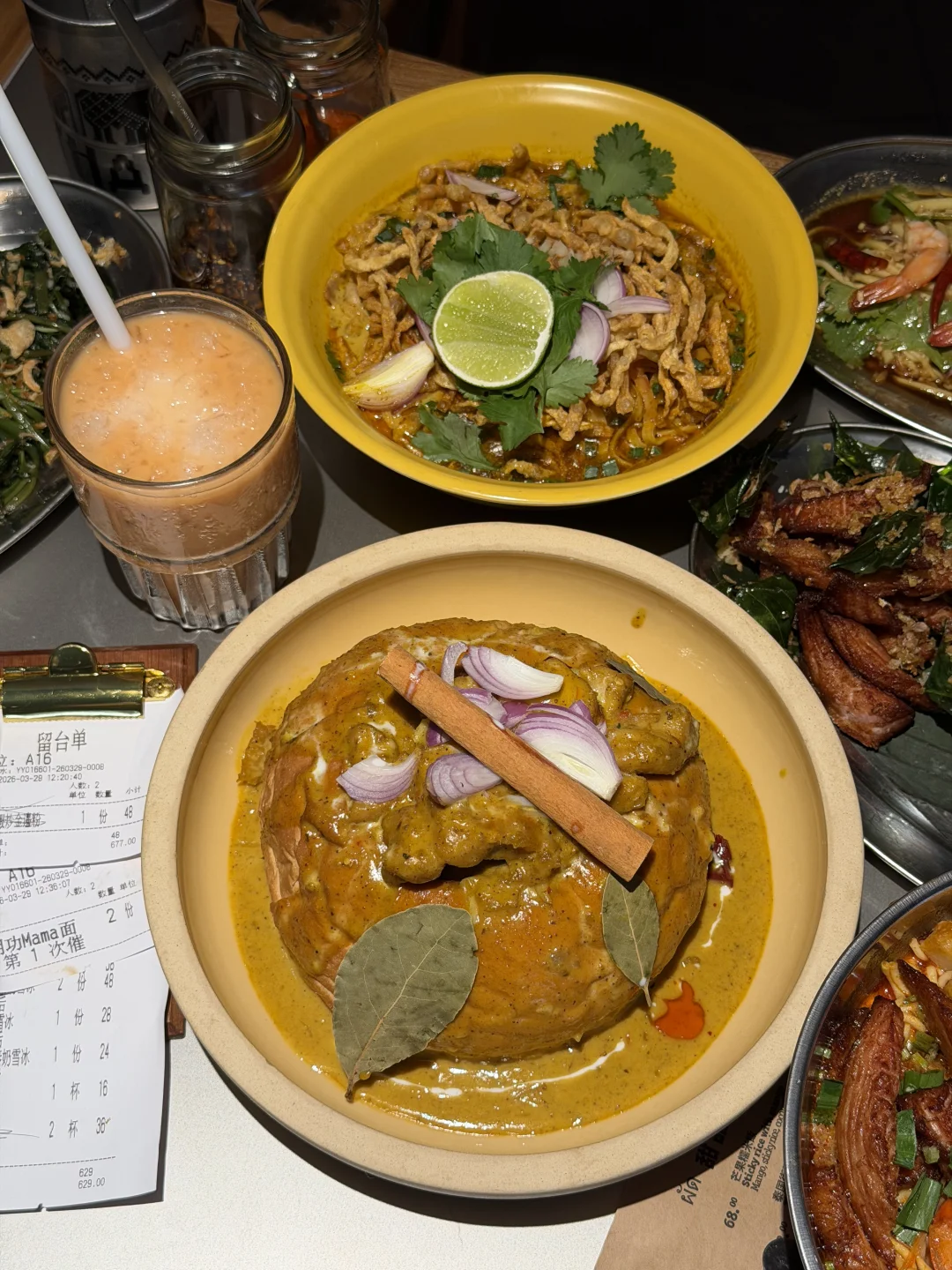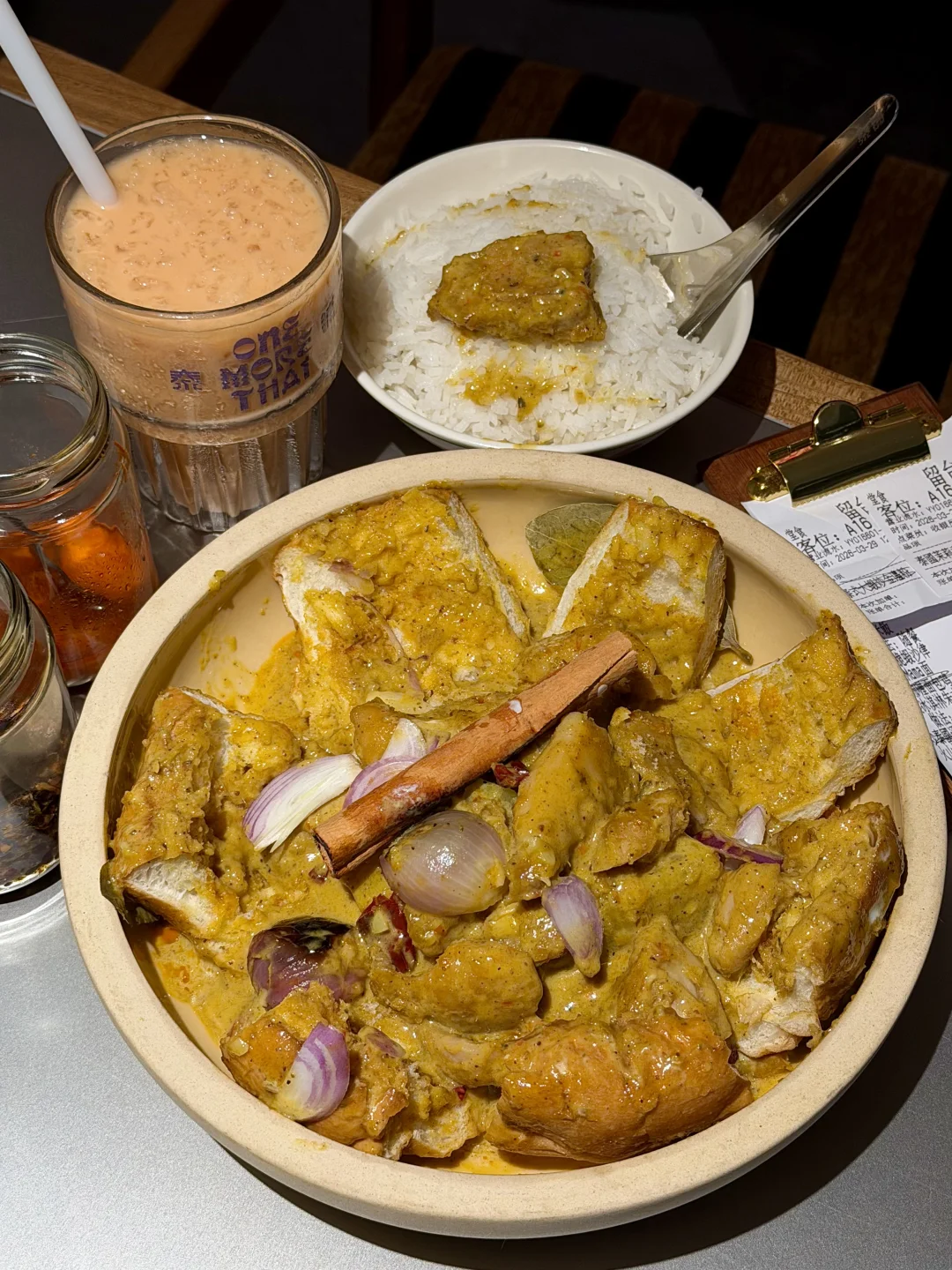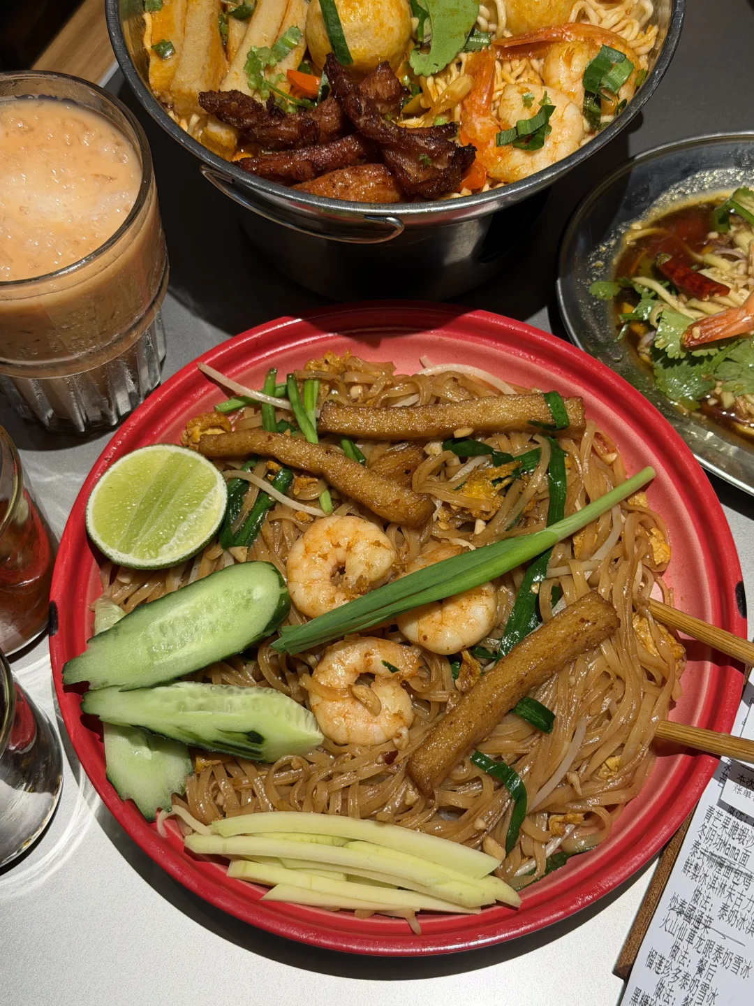 周末才跟朋友去的!就在万象城南区!我对好吃的泰餐真的没有抵抗力😭😭!!! 点的咖喱面包鸡、炸猪颈肉、牛金面都好好吃!墙裂安利mama面,冬阴功味很浓郁!里面食材特别的丰富!!!重点!!!泰奶相关的甜品可以无脑点!点了泰奶冰淇淋朱古力飞饼、火山仙草龙眼泰奶雪冰、还有带榴莲的,泰奶很浓郁不腻,值得反复去吃的!
