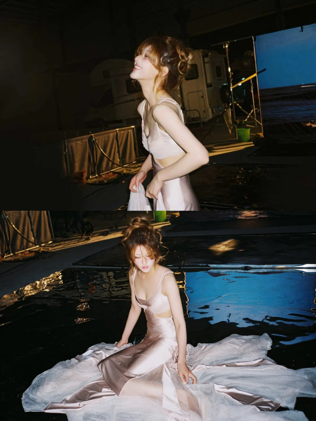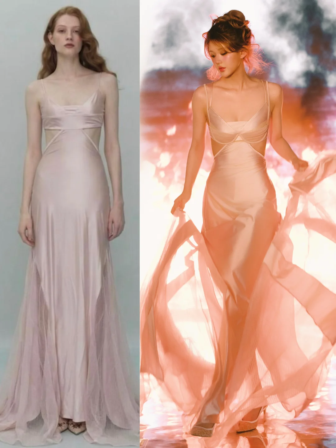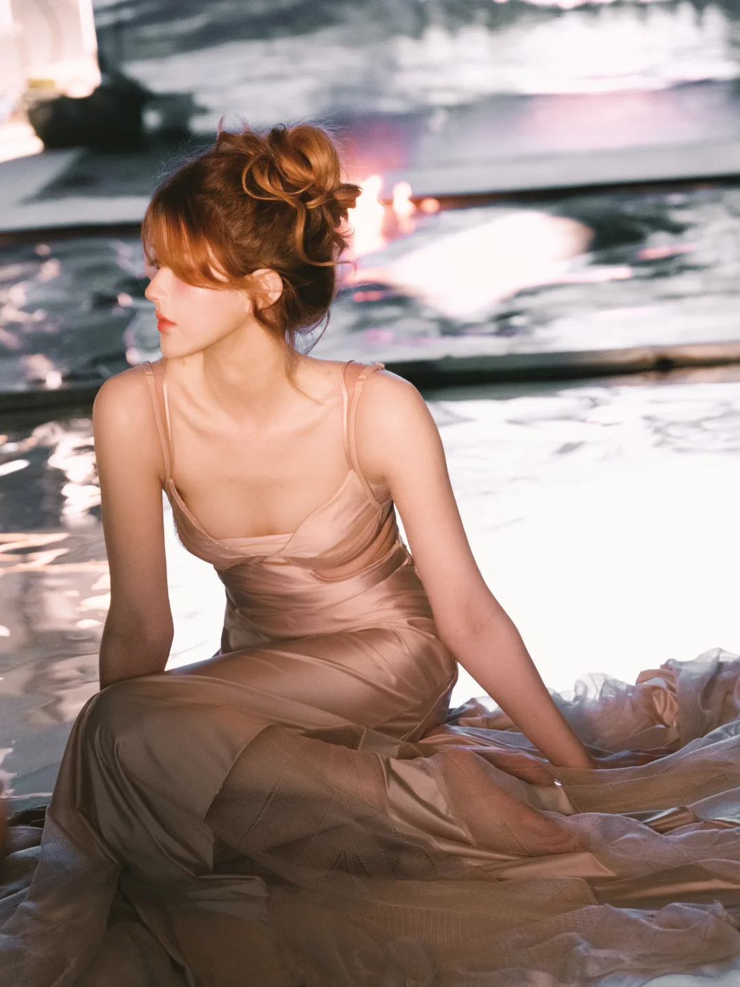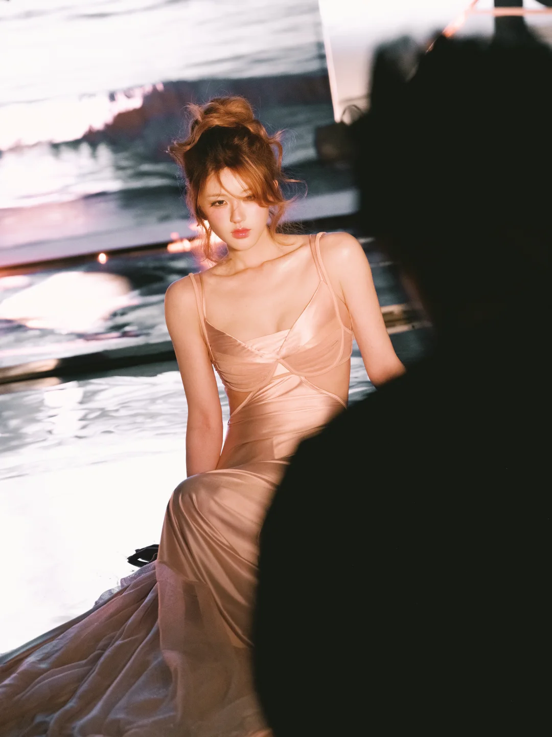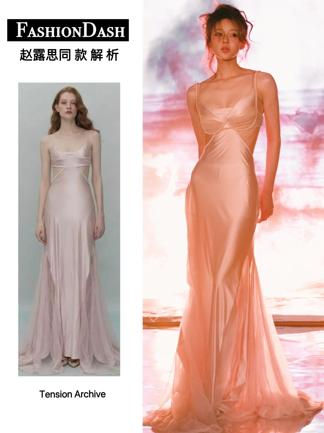 赵露思演唱会造型,礼服来自Tension Archive,香槟粉缎面长裙垂坠得刚刚好,慵懒的高丸子头,整体风格优雅又充满氛围感,碎发与粉橘色挑染增添灵动野性,也有带着锋芒的小性感!